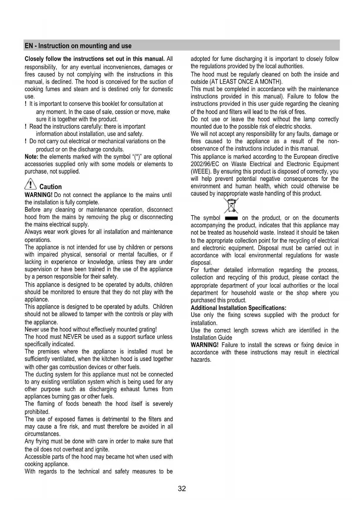 vapours. It is recommended that the cooker hood suction is