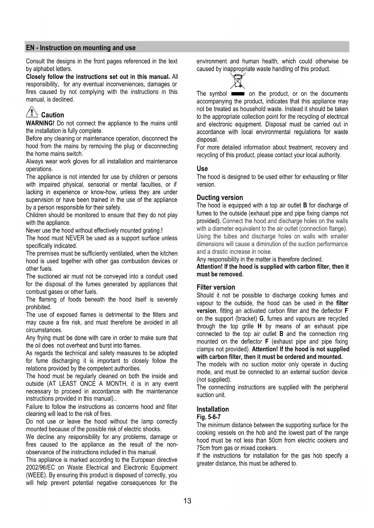 Failure to follow the instructions as concerns hood and filter