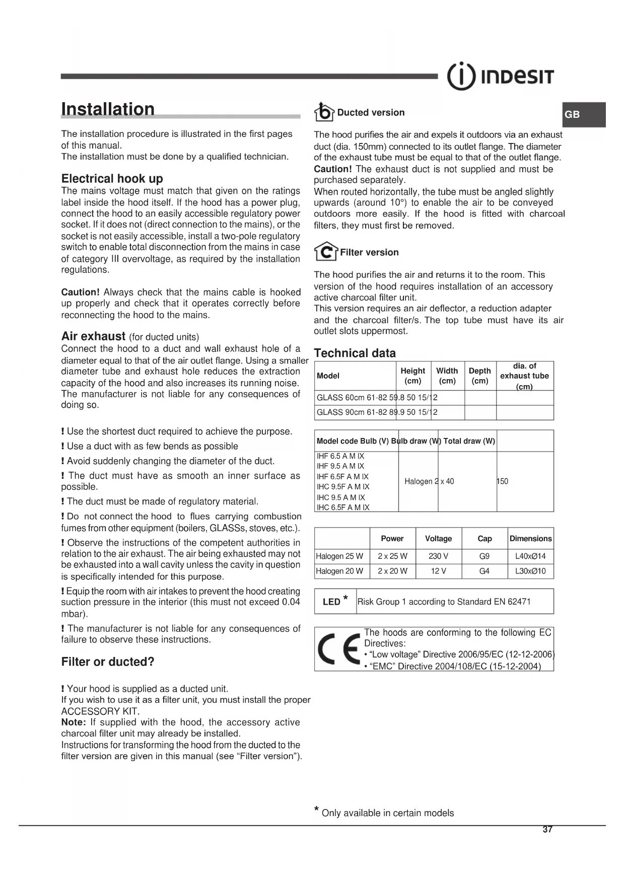 Technical data ModelHeight (cm) Width (cm) Depth (cm) dia. of exhaust tube (cm) GLASS 60cm 61-82 59.8 50 15/12GLASS 90cm 61-82 89.9 50 15/12Model code Bulb (V) Bulb draw (W) Total draw (W)IHF 6.5 A M IXIHF 9.5 A M IXIHF 6.5F A M IXIHC 9.5F A M IXIHC 9.5 A M IXIHC 6.5F A M IXHalogen 2 x 40 150Power Voltage Cap Dimensions Halogen 25 W 2 x 25 W 230 V G9 L40xØ14