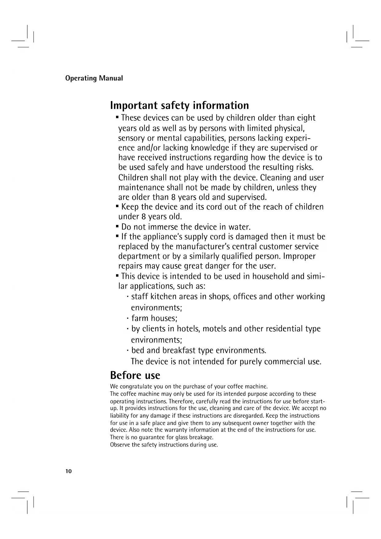 - This device is intended to be used in household and simi- lar applications, such as: ⋅ staff kitchen areas in shops, offices and other working environments; ⋅ farm houses; ⋅ by clients in hotels, motels and other residential type environments; ⋅ bed and breakfast type environments. The device is not intended for purely commercial use. Before use We congratulate you on the purchase of your coffee machine. The coffee machine may only be used for its intended purpose according to these operating instructions. Therefore, carefully read the instructions for use before start- up. It provides instructions for the use, cleaning and care of the device. We accept no liability for any damage if these instructions are disregarded. Keep the instructions for use in a safe place and give them to any subsequent owner together with the device. Also note the warranty information at the end of the instructions for use. There is no guarantee for glass breakage. Observe the safety instructions during use. Operating Manual11