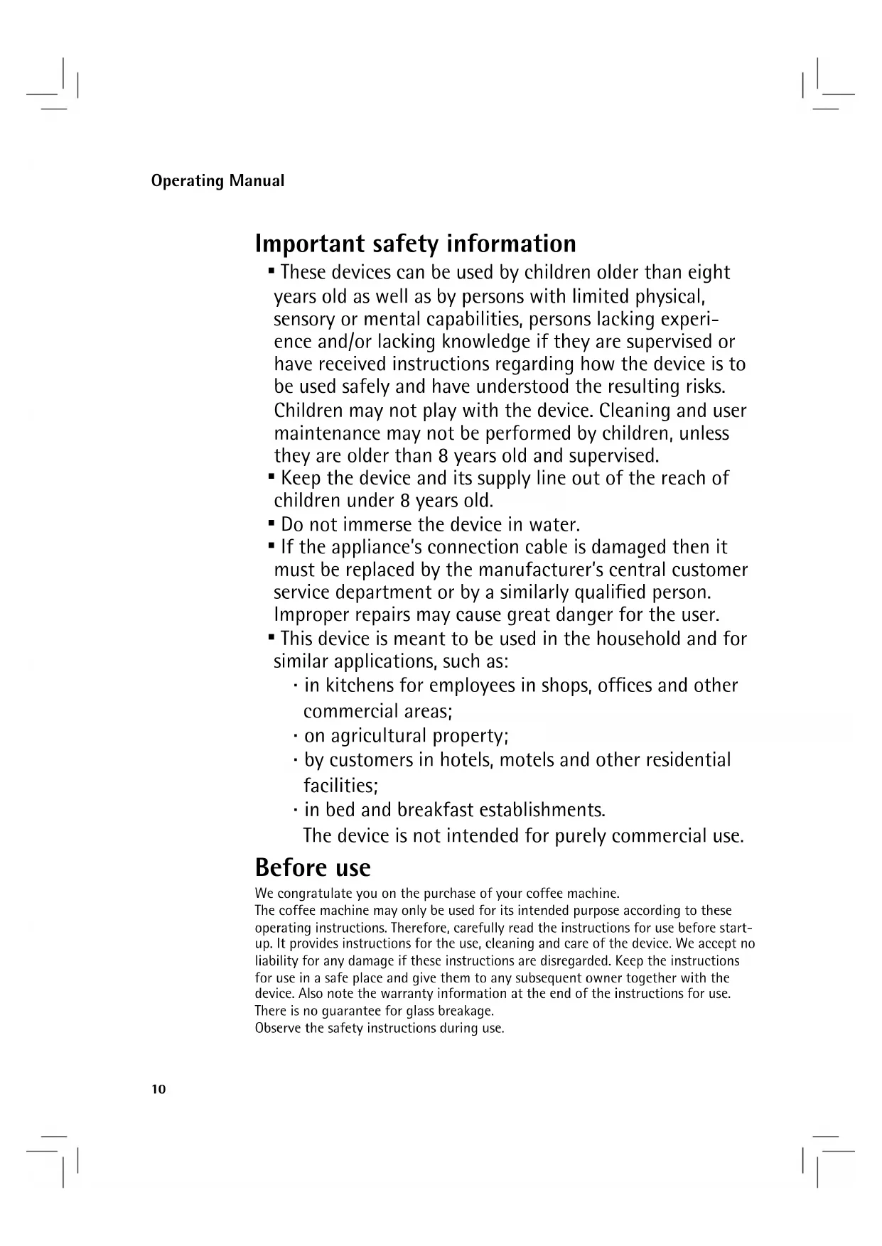- This device is meant to be used in the household and for similar applications, such as: ⋅ in kitchens for employees in shops, offices and other commercial areas; ⋅ on agricultural property; ⋅ by customers in hotels, motels and other residential facilities; ⋅ in bed and breakfast establishments. The device is not intended for purely commercial use. Before use We congratulate you on the purchase of your coffee machine. The coffee machine may only be used for its intended purpose according to these operating instructions. Therefore, carefully read the instructions for use before start- up. It provides instructions for the use, cleaning and care of the device. We accept no liability for any damage if these instructions are disregarded. Keep the instructions for use in a safe place and give them to any subsequent owner together with the device. Also note the warranty information at the end of the instructions for use. There is no guarantee for glass breakage. Observe the safety instructions during use. Operating Manual11