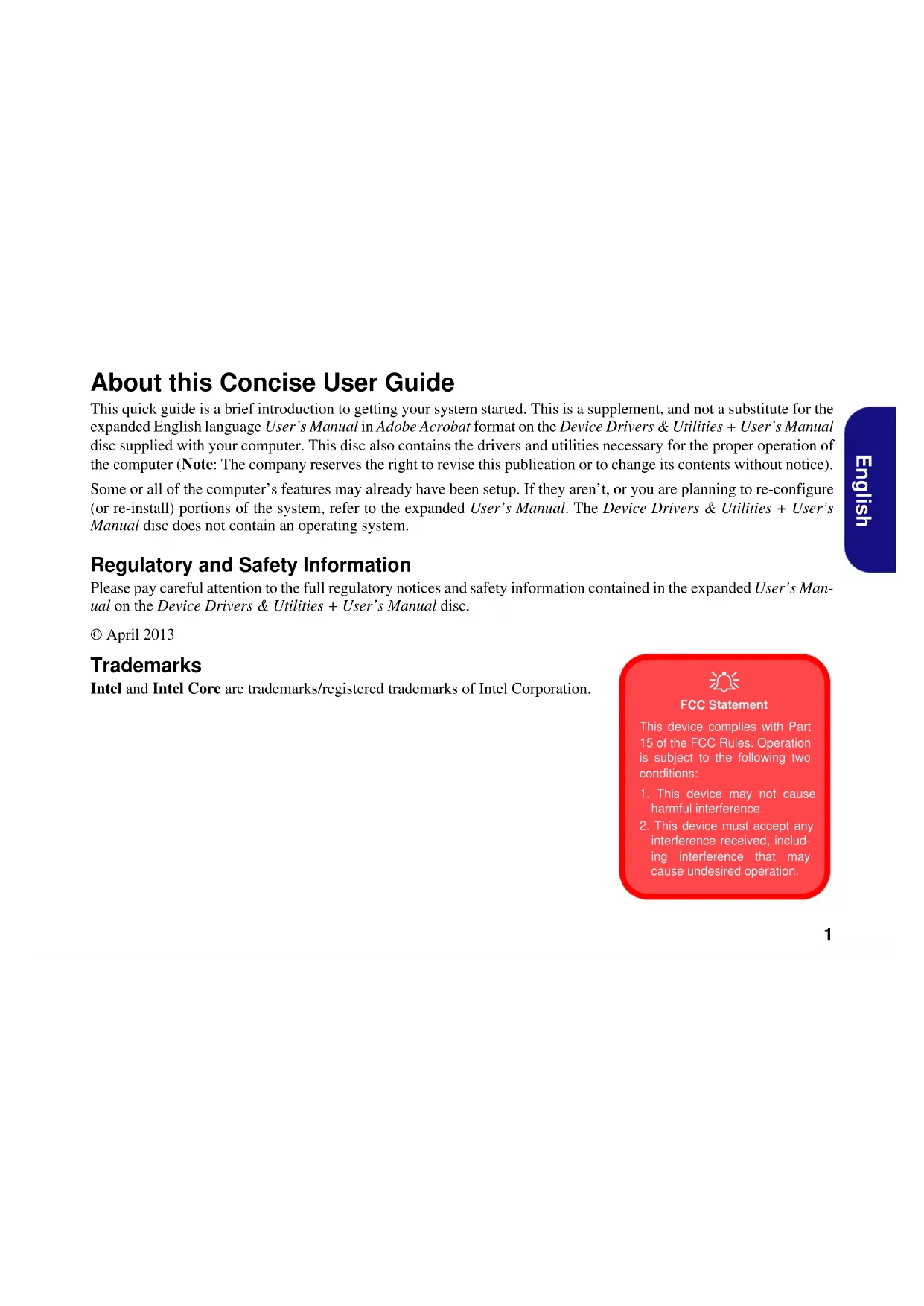 FCC StatementThis device complies with Part15 of the FCC Rules. Operationis subject to the following twoconditions: 1. This device may not causeharmful interference. 2. This device must accept anyinterference received, includ-ing interference that maycause undesired operation.2 English Instructions for Care and Operation The computer is quite rugged, but it can be damaged. To prevent this, follow these suggestions: