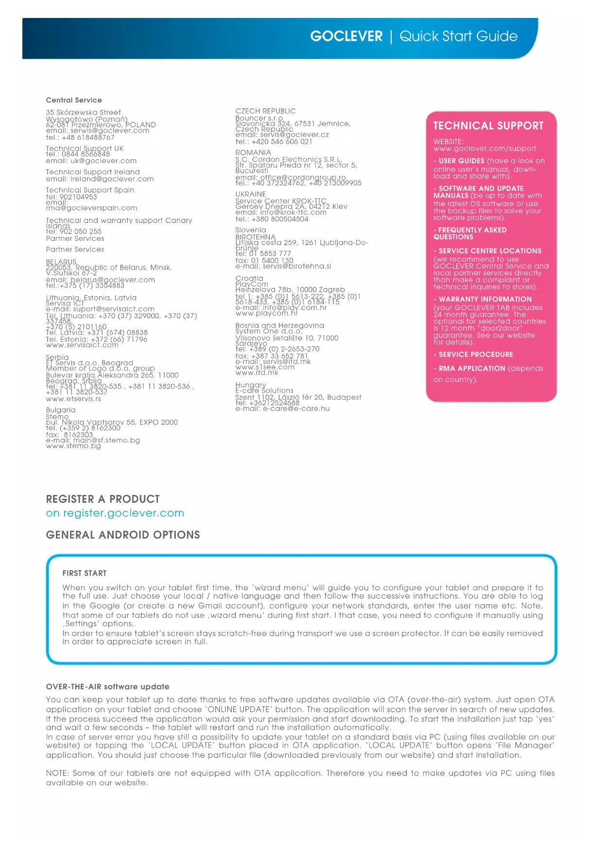 on register.goclever.com OVER-THE-AIR software update You can keep your tablet up to date thanks to free software updates available via OTA (over-the-air) system. Just open OTA application on your tablet and choose ‘ONLINE UPDATE’ button. The application will scan the server in search of new updates. If the process succeed the application would ask your permission and start downloading. To start the installation just tap ‘yes’ and wait a few seconds – the tablet will restart and run the installation automatically. In case of server error you have still a possibility to update your tablet on a standard basis via PC (using files available on our website) or tapping the ‘LOCAL UPDATE’ button placed in OTA application. ‘LOCAL UPDATE’ button opens ‘File Manager’ application. You should just choose the particular file (downloaded previously from our website) and start installation. NOTE: Some of our tablets are not equipped with OTA application. Therefore you need to make updates via PC using files available on our website.CHARGING THE BATTERY Battery life depends on usage. Please note that only use an authorized charger (included) as incorrect voltage /am page can damage the GOCLEVER TAB, invalidating your guarantee. When the device is used for the first time we recommend you charge it for around 8-12 hours using the power adaptor provided and do not disconnect the charger until a device is fully charged. User can charge the battery when there is still power left. Note that while charging it is normal that both charger and tablet is heating up. If you hardly ever use the tablet, we recommend to charge it at least one per month to maintain a battery life. [24/03/2014 09:17:26] Anna Goclever: To cut time charging please chargé tablet quantum 700m when screen is turn off. When you chargé and use tablet time charing can extend even to 6 hours. FACTORY RESET In the case where you lend/sell your device to somebody and want to delete all your personal data you can reset your tablet to the default settings. Please be aware that all your personal files, applications and data (multimedia, music, photos, videos) will be lost. If you hold SD card in the device’s slot and want to keep your data on it you should remove the card from the tablet before a reset. To make a factory reset simply press as follows:
