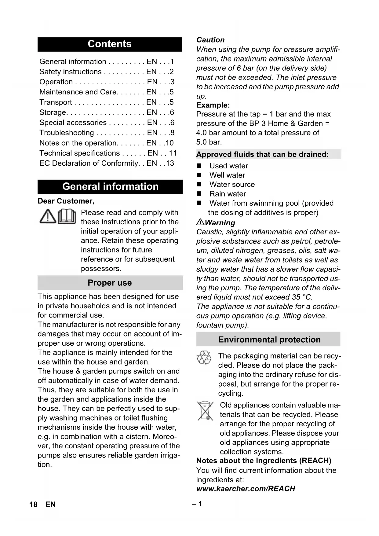• Used water Well water Water source Rain water Water from swimming pool (provided the dosing of additives is proper) 몇 Warning Caustic, slightly inflammable and other ex- plosive substances such as petrol, petrole- um, diluted nitrogen, greases, oils, salt wa- ter and waste water from toilets as well as sludgy water that has a slower flow capaci- ty than water, should not be transported us- ing the pump. The temperature of the deliv- ered liquid must not exceed 35 °C. The appliance is not suitable for a continu- ous pump operation (e.g. lifting device, fountain pump). The packaging material can be recy- cled. Please do not place the pack- aging into the ordinary refuse for dis- posal, but arrange for the proper re- cycling. Old appliances contain valuable ma- terials that can be recycled. Please arrange for the proper recycling of old appliances. Please dispose your old appliances using appropriate collection systems. Notes about the ingredients (REACH) You will find current information about the ingredients at: www.kaercher.com/REACH Contents General information