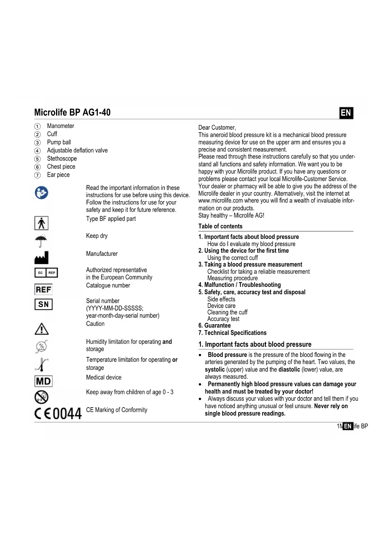 Dear Customer, This aneroid blood pressure kit is a mechanical blood pressure measuring device for use on the upper arm and ensures you a precise and consistent measurement. Please read through these instructions carefully so that you under- stand all functions and safety information. We want you to be happy with your Microlife product. If you have any questions or problems please contact your local Microlife-Customer Service. Your dealer or pharmacy will be able to give you the address of the Microlife dealer in your country. Alternatively, visit the internet at www.microlife.com where you will find a wealth of invaluable infor- mation on our products. Stay healthy – Microlife AG! Table of contents