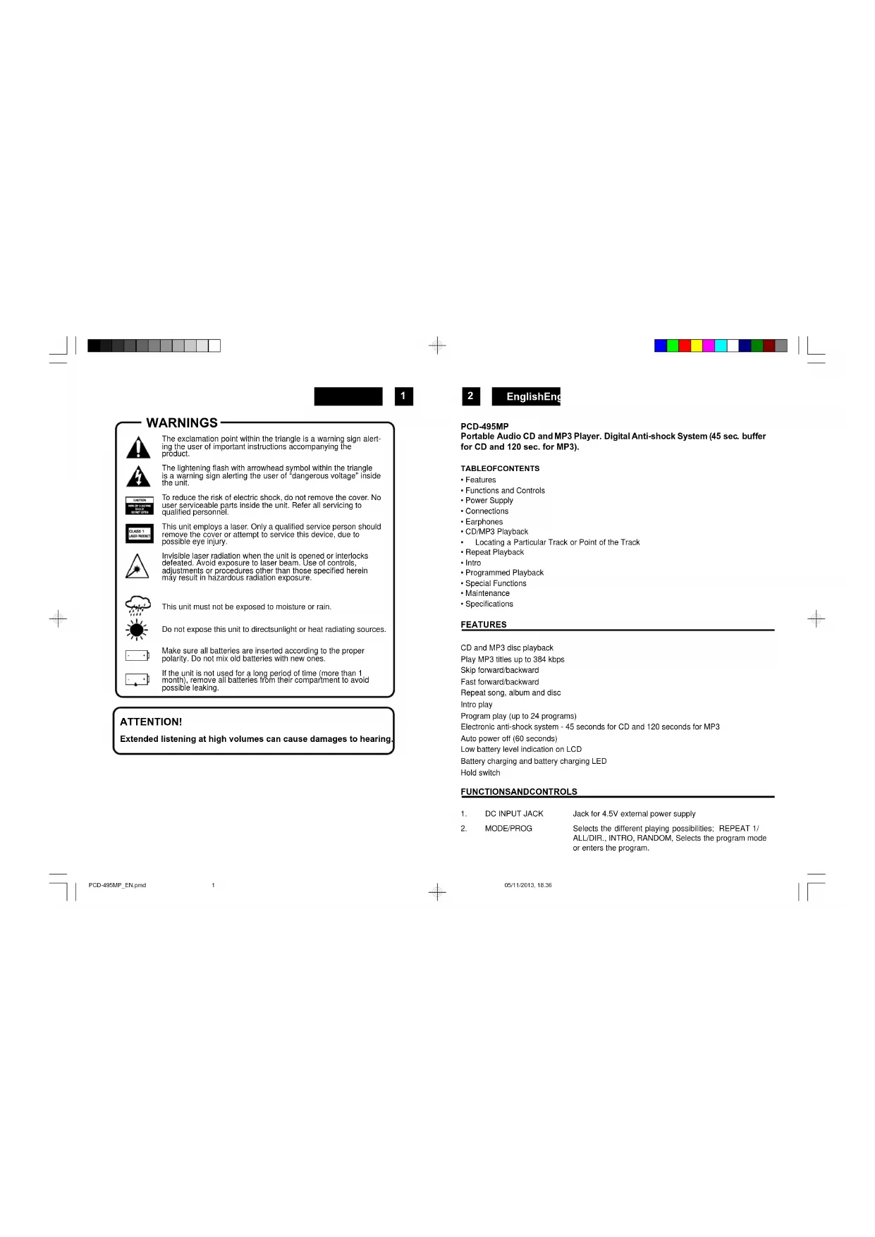 The exclamation point within the triangle is a warning sign alert- ing the user of important instructions accompanying the product. The lightening flash with arrowhead symbol within the triangle is a warning sign alerting the user of “dangerous voltage” inside the unit. To reduce the risk of electric shock, do not remove the cover. No user serviceable parts inside the unit. Refer all servicing to qualified personnel. This unit employs a laser. Only a qualified service person should remove the cover or attempt to service this device, due to possible eye injury. Invisible laser radiation when the unit is opened or interlocks defeated. Avoid exposure to laser beam. Use of controls, adjustments or procedures other than those specified herein may result in hazardous radiation exposure. This unit must not be exposed to moisture or rain. Do not expose this unit to directsunlight or heat radiating sources. Make sure all batteries are inserted according to the proper polarity. Do not mix old batteries with new ones. If the unit is not used for a long period of time (more than 1 month), remove all batteries from their compartment to avoid possible leaking. WARNINGS PCD-495MP Portable Audio CD and MP3 Player. Digital Anti-shock System (45 sec. buffer for CD and 120 sec. for MP3). TABLEOFCONTENTS