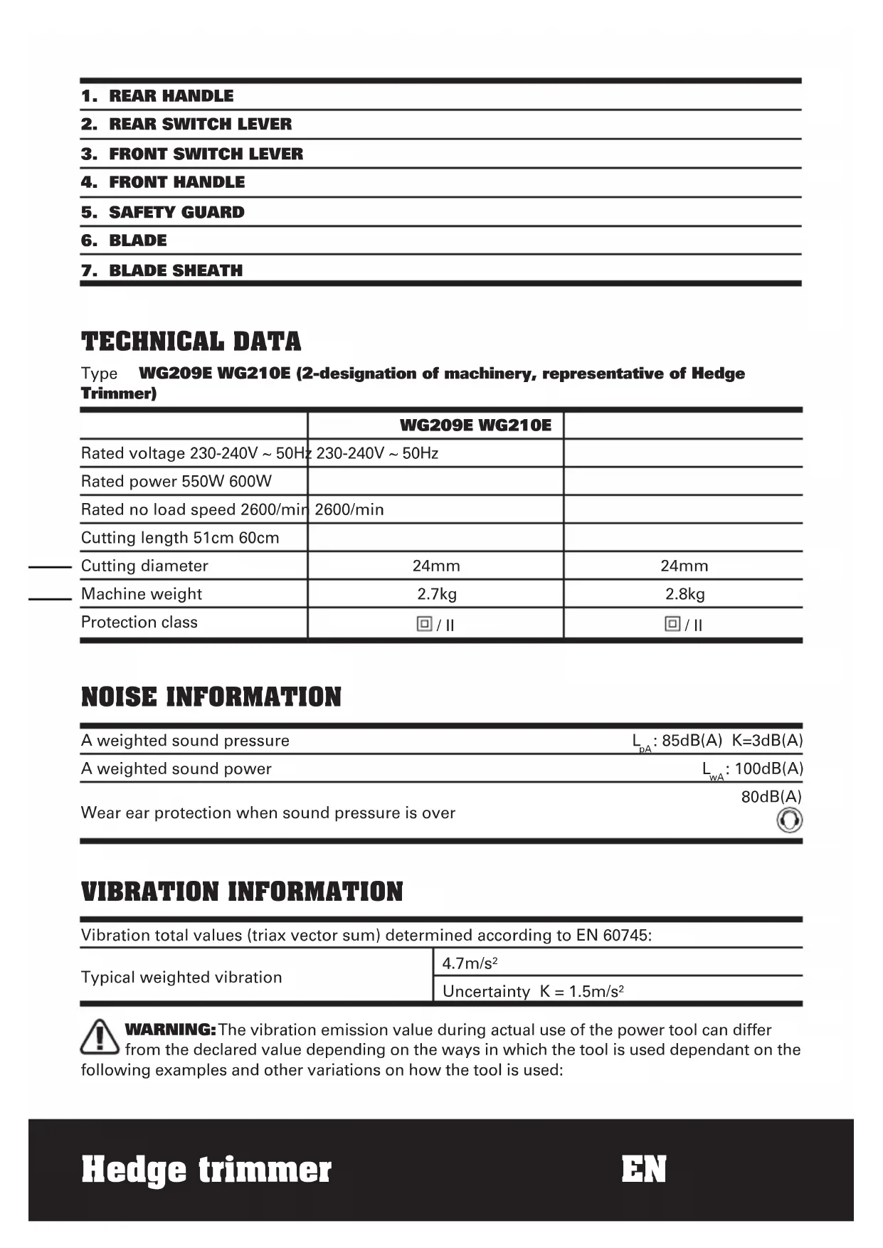 7. BLADE SHEATH TEChNICAL DATA Type WG209E WG210E (2-designation of machinery, representative of Hedge