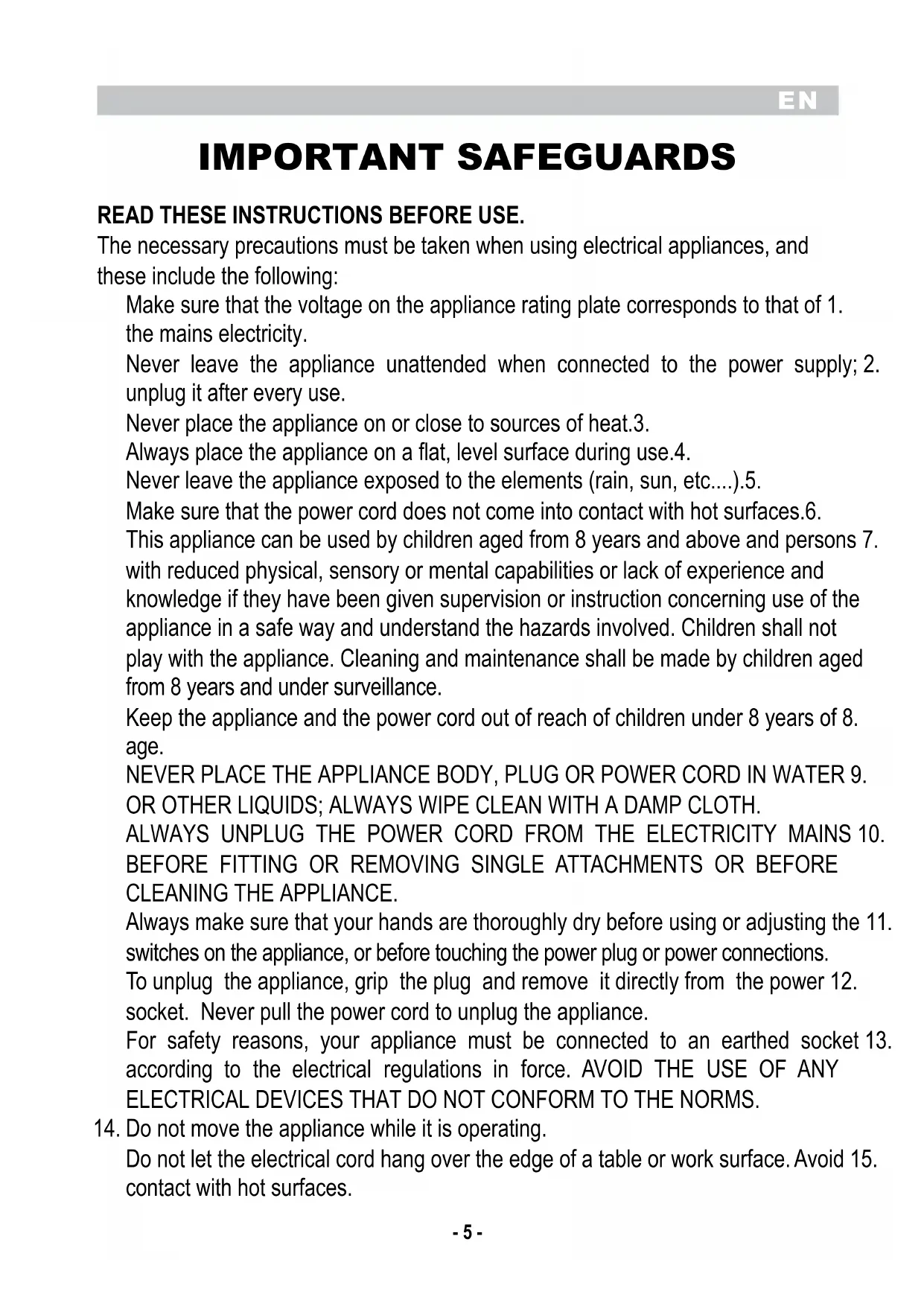 NEVER PLACE THE APPLIANCE BODY, PLUG OR POWER CORD IN WATER 9.