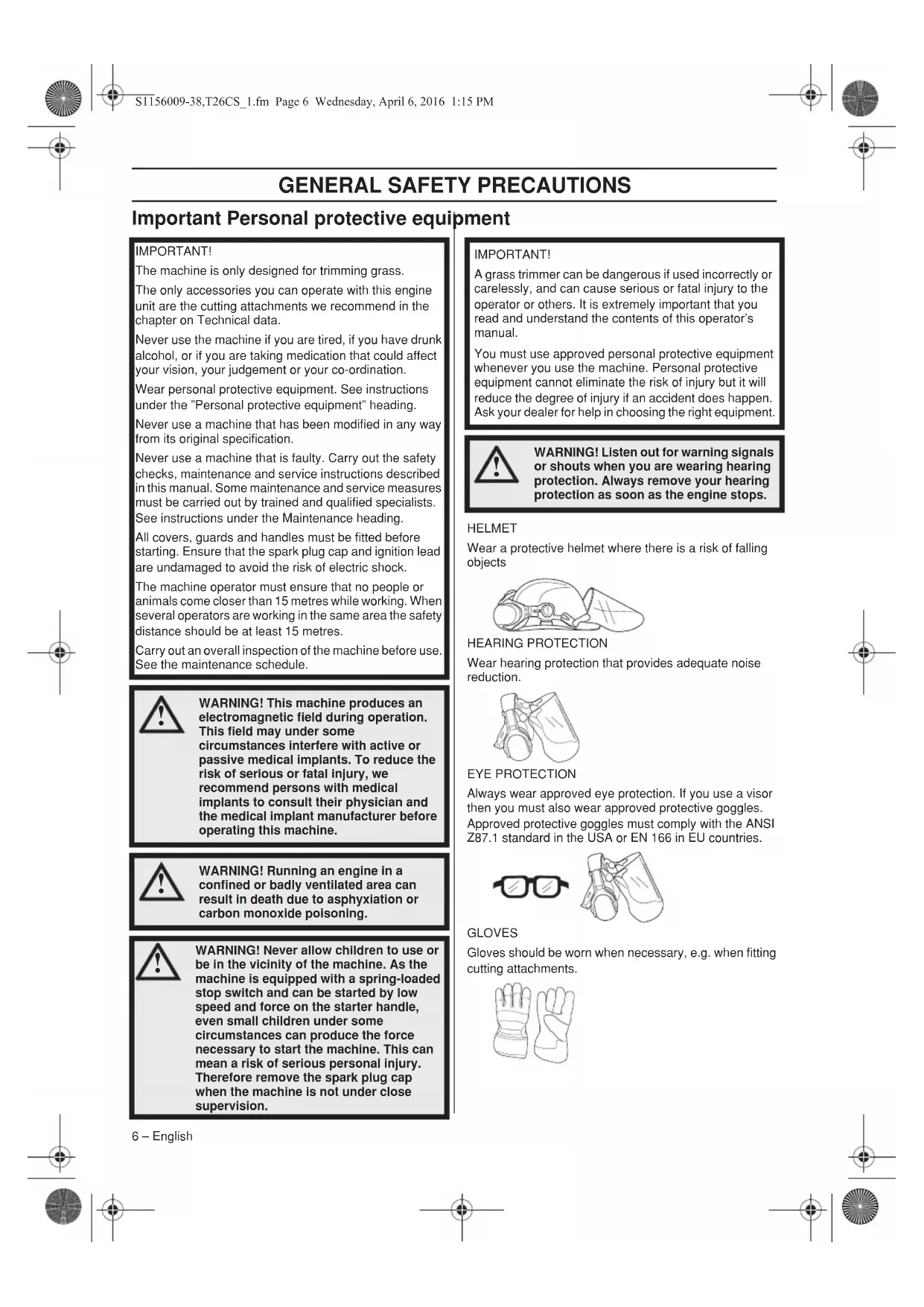 s manual 16 Locking pin S1156009-38,T26CS_1.fm Page 5 Wednesday, April 6, 2016 1:15 PMGENERAL SAFETY PRECAUTIONS 6 – English Important Personal protective equipment HELMET Wear a protective helmet where there is a risk of falling objects HEARING PROTECTION Wear hearing protection that provides adequate noise reduction. EYE PROTECTION Always wear approved eye protection. If you use a visor then you must also wear approved protective goggles. Approved protective goggles must comply with the ANSI Z87.1 standard in the USA or EN 166 in EU countries. GLOVES Gloves should be worn when necessary, e.g. when fitting cutting attachments. IMPORTANT! The machine is only designed for trimming grass. The only accessories you can operate with this engine unit are the cutting attachments we recommend in the chapter on Technical data. Never use the machine if you are tired, if you have drunk alcohol, or if you are taking medication that could affect your vision, your judgement or your co-ordination. Wear personal protective equipment. See instructions under the ”Personal protective equipment” heading. Never use a machine that has been modified in any way from its original specification. Never use a machine that is faulty. Carry out the safety checks, maintenance and service instructions described in this manual. Some maintenance and service measures must be carried out by trained and qualified specialists. See instructions under the Maintenance heading. All covers, guards and handles must be fitted before starting. Ensure that the spark plug cap and ignition lead are undamaged to avoid the risk of electric shock. The machine operator must ensure that no people or animals come closer than 15 metres while working. When several operators are working in the same area the safety distance should be at least 15 metres. Carry out an overall inspection of the machine before use. See the maintenance schedule.