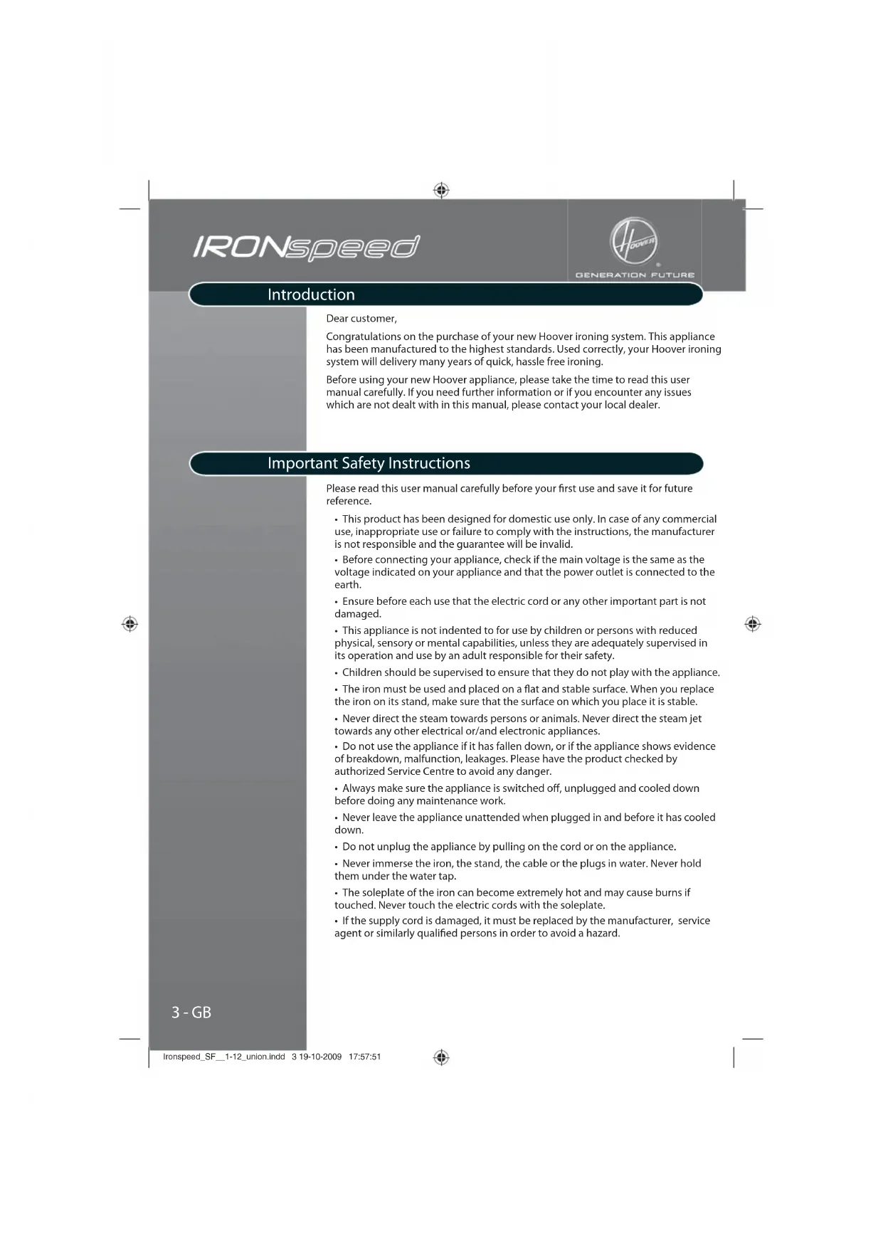 has been manufactured to the highest standards. Used correctly, your Hoover ironing