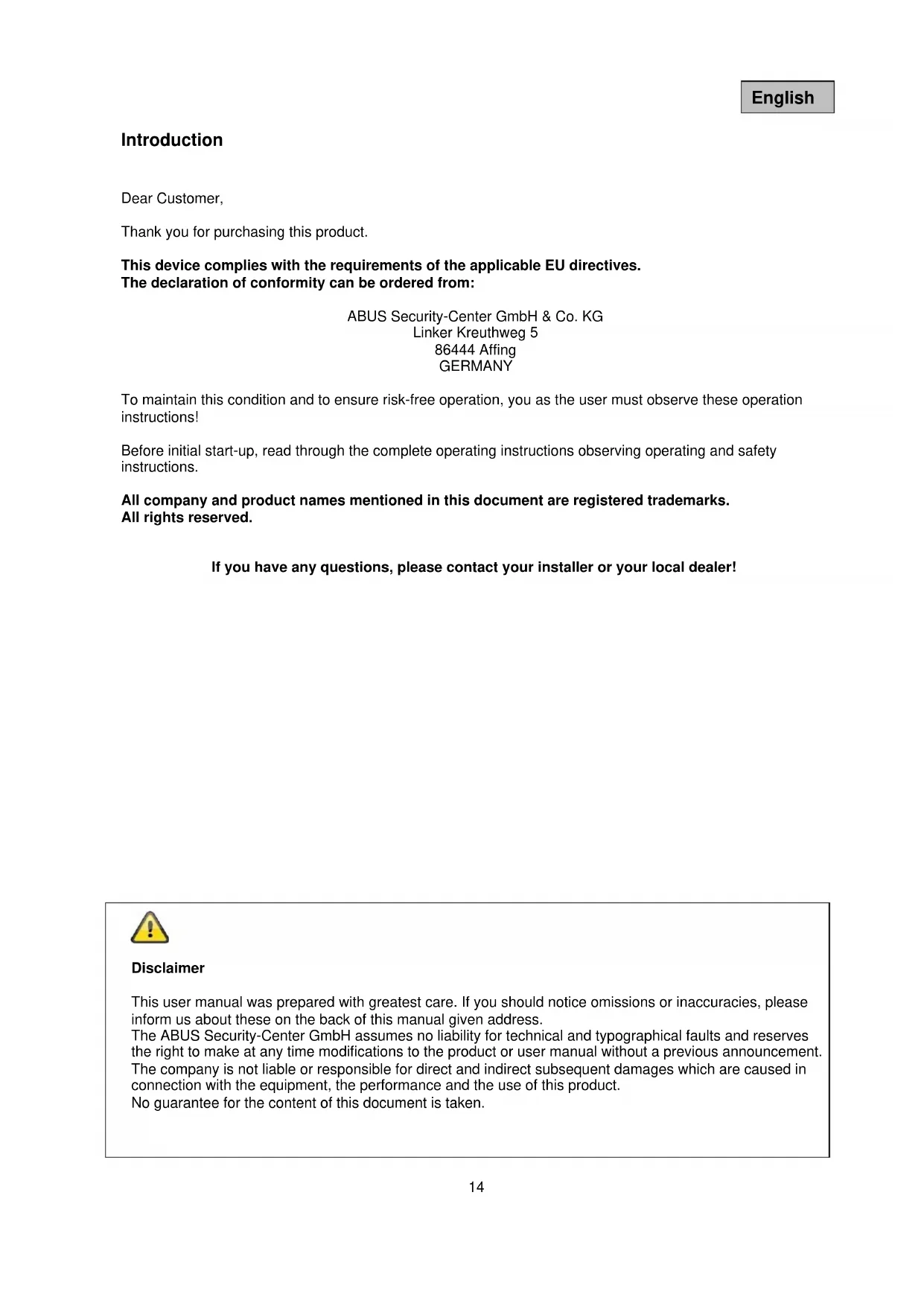 Dear Customer, Thank you for purchasing this product. This device complies with the requirements of the applicable EU directives. The declaration of conformity can be ordered from: ABUS Security-Center GmbH & Co. KG Linker Kreuthweg 5 86444 Affing GERMANY To maintain this condition and to ensure risk-free operation, you as the user must observe these operation instructions! Before initial start-up, read through the complete operating instructions observing operating and safety instructions. All company and product names mentioned in this document are registered trademarks. All rights reserved.