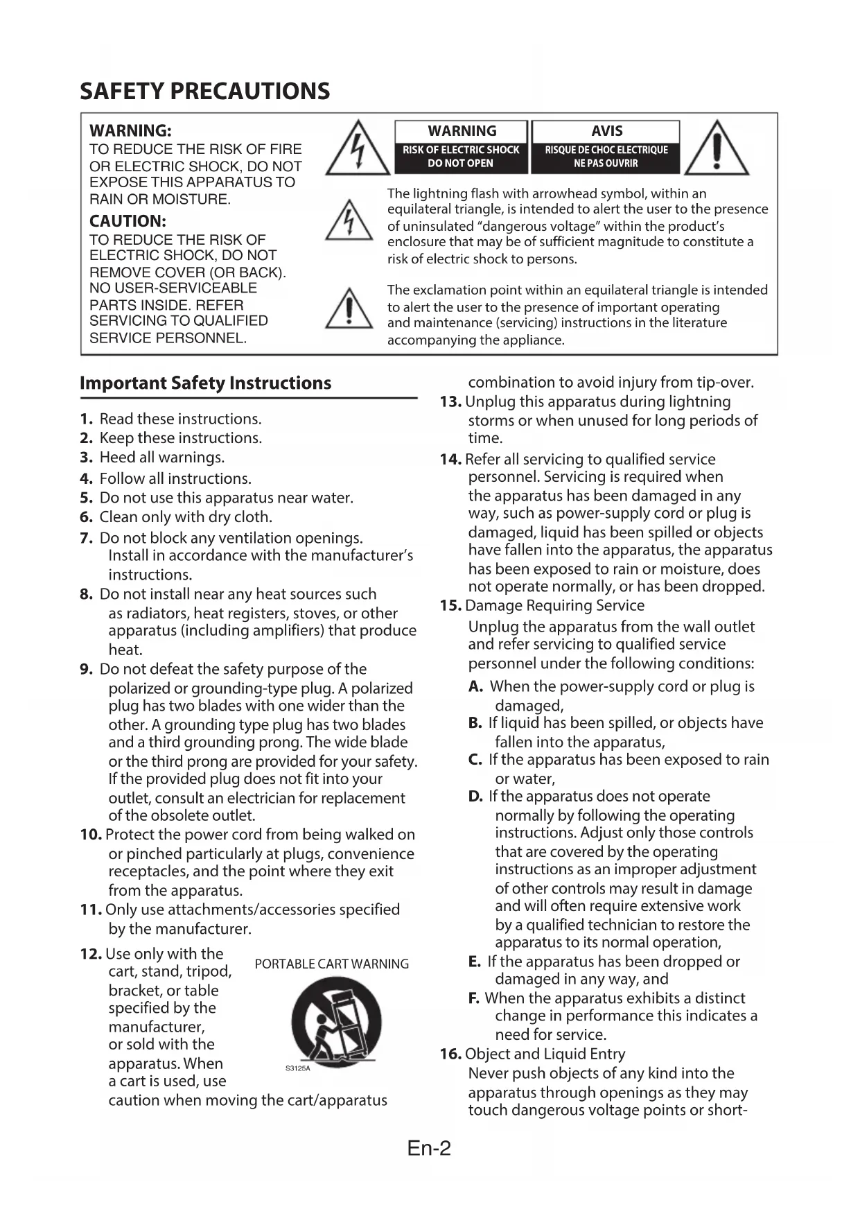 SAFETY PRECAUTIONS WARNING: TO REDUCE THE RISK OF FIRE OR ELECTRIC SHOCK, DO NOT EXPOSE THIS APPARATUS TO RAIN OR MOISTURE. CAUTION: TO REDUCE THE RISK OF ELECTRIC SHOCK, DO NOT REMOVE COVER (OR BACK). NO USER-SERVICEABLE PARTS INSIDE. REFER SERVICING TO QUALIFIED SERVICE PERSONNEL.WARNINGRISK OF ELECTRIC SHOCK DO NOT OPEN AVIS RISQUE DE CHOC ELECTRIQUE NE PAS OUVRIRThe lightning flash with arrowhead symbol, within an equilateral triangle, is intended to alert the user to the presence of uninsulated “dangerous voltage” within the product’s enclosure that may be of sufficient magnitude to constitute a risk of electric shock to persons.The exclamation point within an equilateral triangle is intended to alert the user to the presence of important operating and maintenance (servicing) instructions in the literature accompanying the appliance. Important Safety Instructions