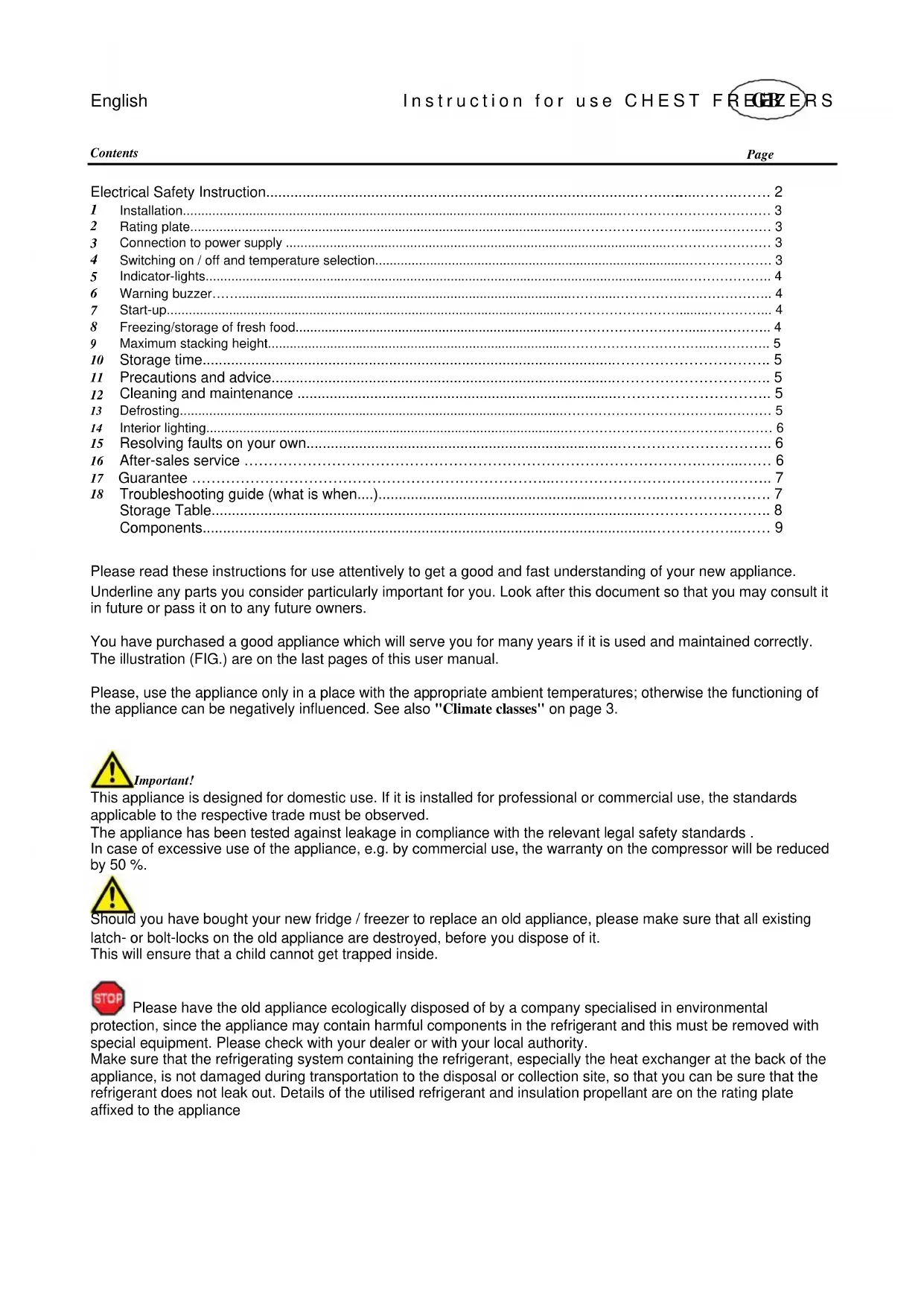 protection, since the appliance may contain harmful components in the refrigerant and this must be removed with special equipment. Please check with your dealer or with your local authority.