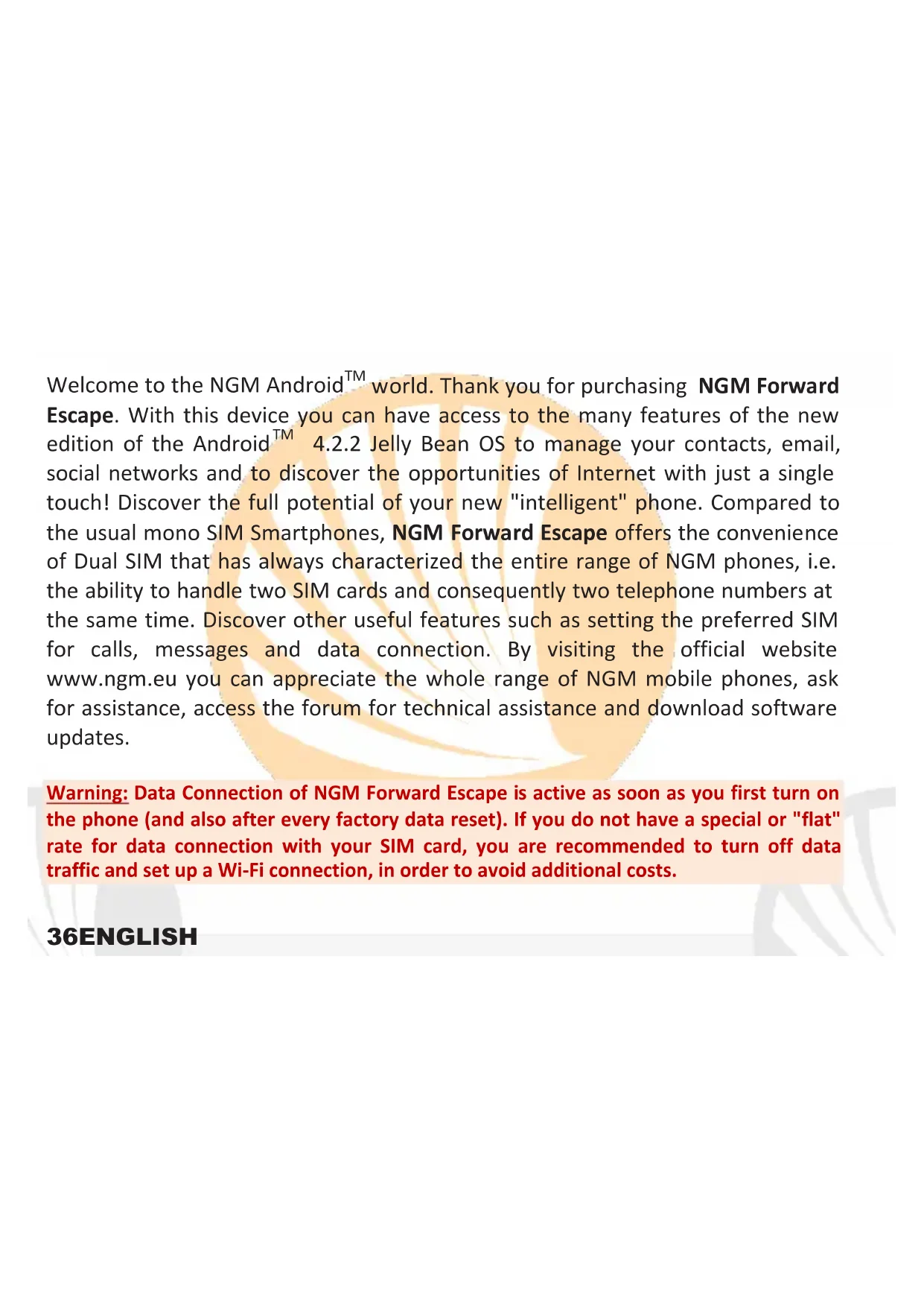 Note: you can set ringtones in *mid,*wav, *ogg or *mp3 formats.47ENGLISH Sending and reading SMS and MMS Reading SMS and MMS: when you receive a new SMS or MMS, an icon appears in the notification panel. By clicking on the appeared icon, you can access directly to the conversation and read the incoming message. In any case, you can view the incoming messages from the home screen or menu, by selecting Messaging. Send SMS and MMS From the Home page or from the main menu, choose Messaging and then the icon the bottom. Type the first letters of a name in the recipient field to search for a contact, select it from the pop-up or directly enter the recipient number, otherwise select the icon and select the recipient(s). Write the text into the dedicated space with the virtual keypad. Select the "+" icon to insert eventual multimedia files (the message will automatically be converted into MMS) and press the key, selecting the SIM you want to use. CONNECTIVITY: to better use the potentiality provided by the device and its operating system, you must have an active data connection; data connection of NGM Forward Escape is ON when you first power on the phone. If it is not included into your mobile phone plan, data traffic may cause you extra costs, so it is recommended to configure Internet connection via WiFi. To enable data traffic on one of the SIM cards, select Settings > Dual SIM Manager > Data connection, or activate it from the Quick Setup buttons in the notifications panel.48 ENGLISH Connecting to Internet with WiFi® You can connect to WLAN by using the Wi-Fi function. To activate it, choose Settings > WiFi. Please follow all warnings and indications concerning the use of wireless devices in areas where the use of such functions is restricted (airplanes, hospitals, etc.). Go offline mode when you have to use only the functions that do not require Network access.