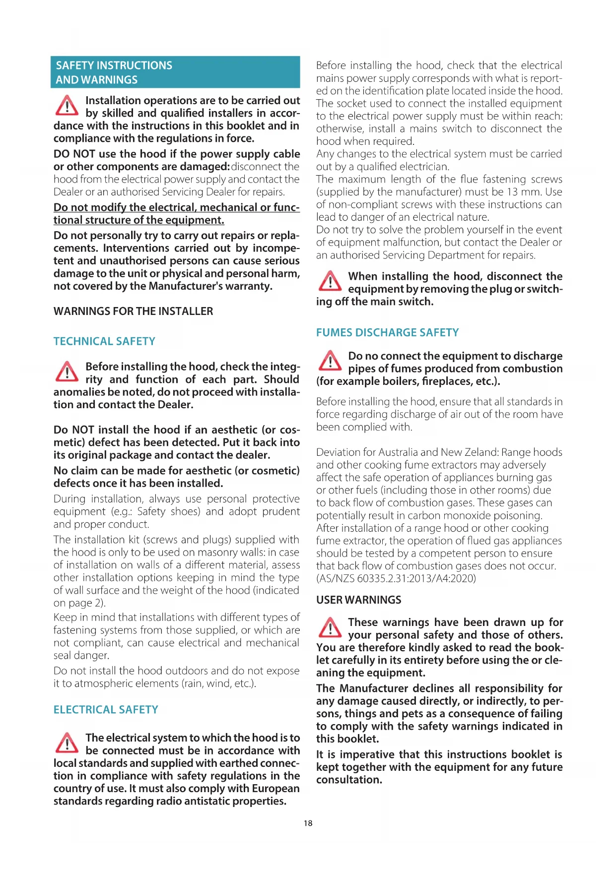 WARNINGS FOR THE INSTALLER TECHNICAL SAFETY Before installing the hood, check the integ-