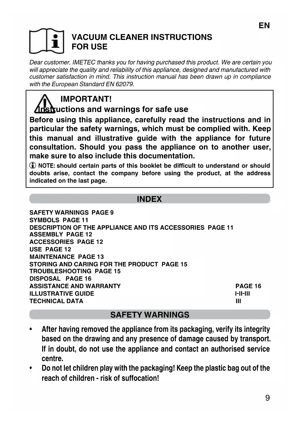 manutenzione del prodotto fanno decadere il diritto alla garanzia del produttore.VACUUM CLEANER INSTRUCTIONS FOR USE Dear customer, IMETEC thanks you for having purchased this product. We are certain you