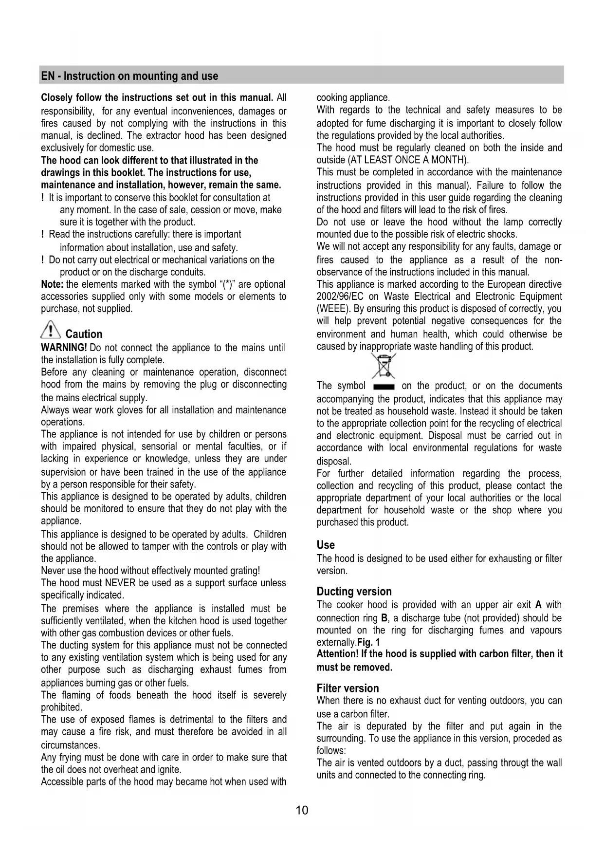 Closely follow the instructions set out in this manual. All responsibility, for any eventual inconveniences, damages or fires caused by not complying with the instructions in this manual, is declined. The extractor hood has been designed exclusively for domestic use.