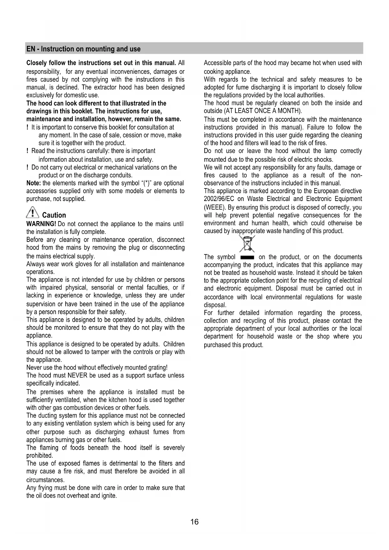 Closely follow the instructions set out in this manual. All responsibility, for any eventual inconveniences, damages or fires caused by not complying with the instructions in this manual, is declined. The extractor hood has been designed exclusively for domestic use.