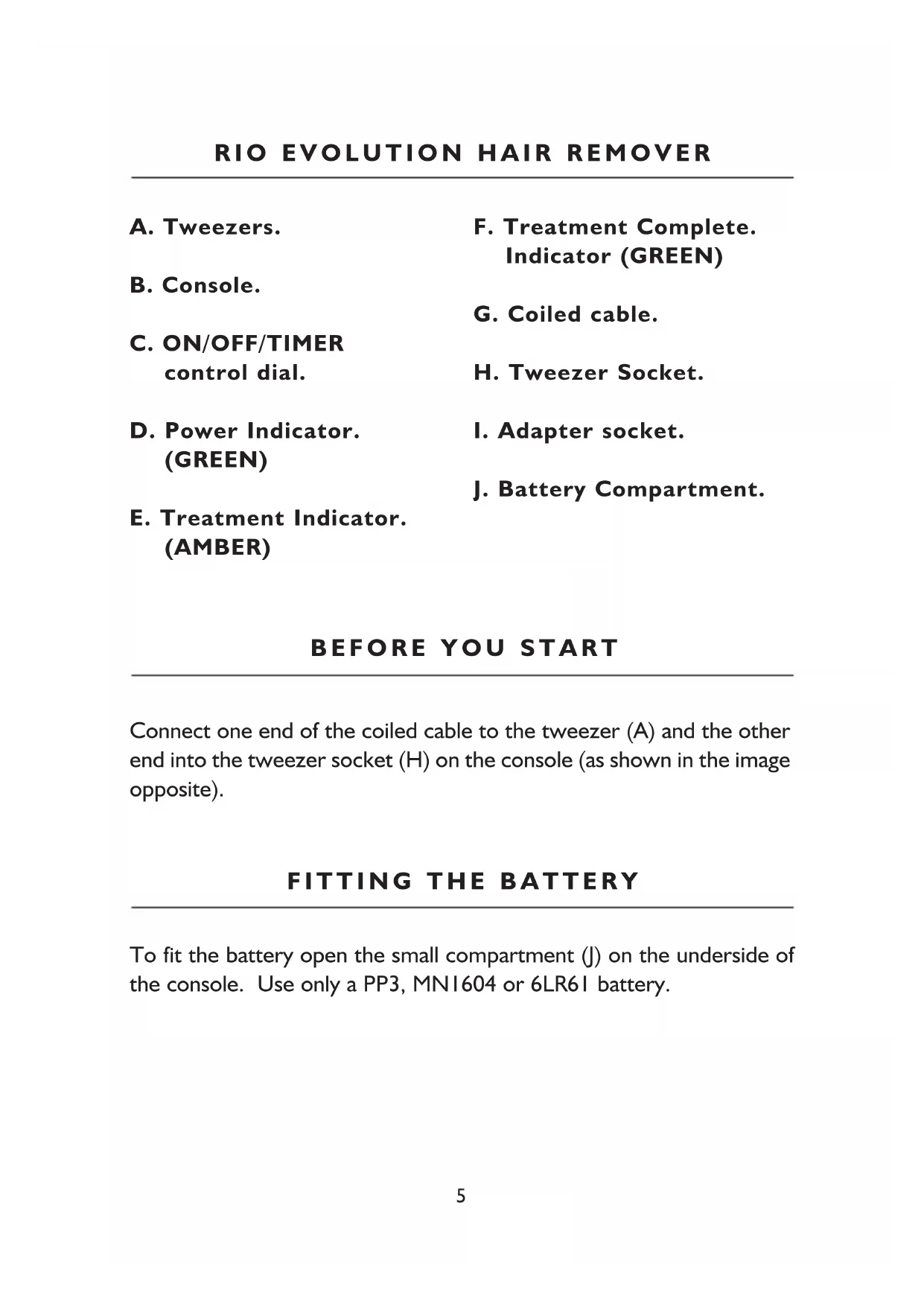 control dial. D. Power Indicator. (GREEN) E. Treatment Indicator. (AMBER) F. Treatment Complete. Indicator (GREEN) G. Coiled cable. H. Tweezer Socket.