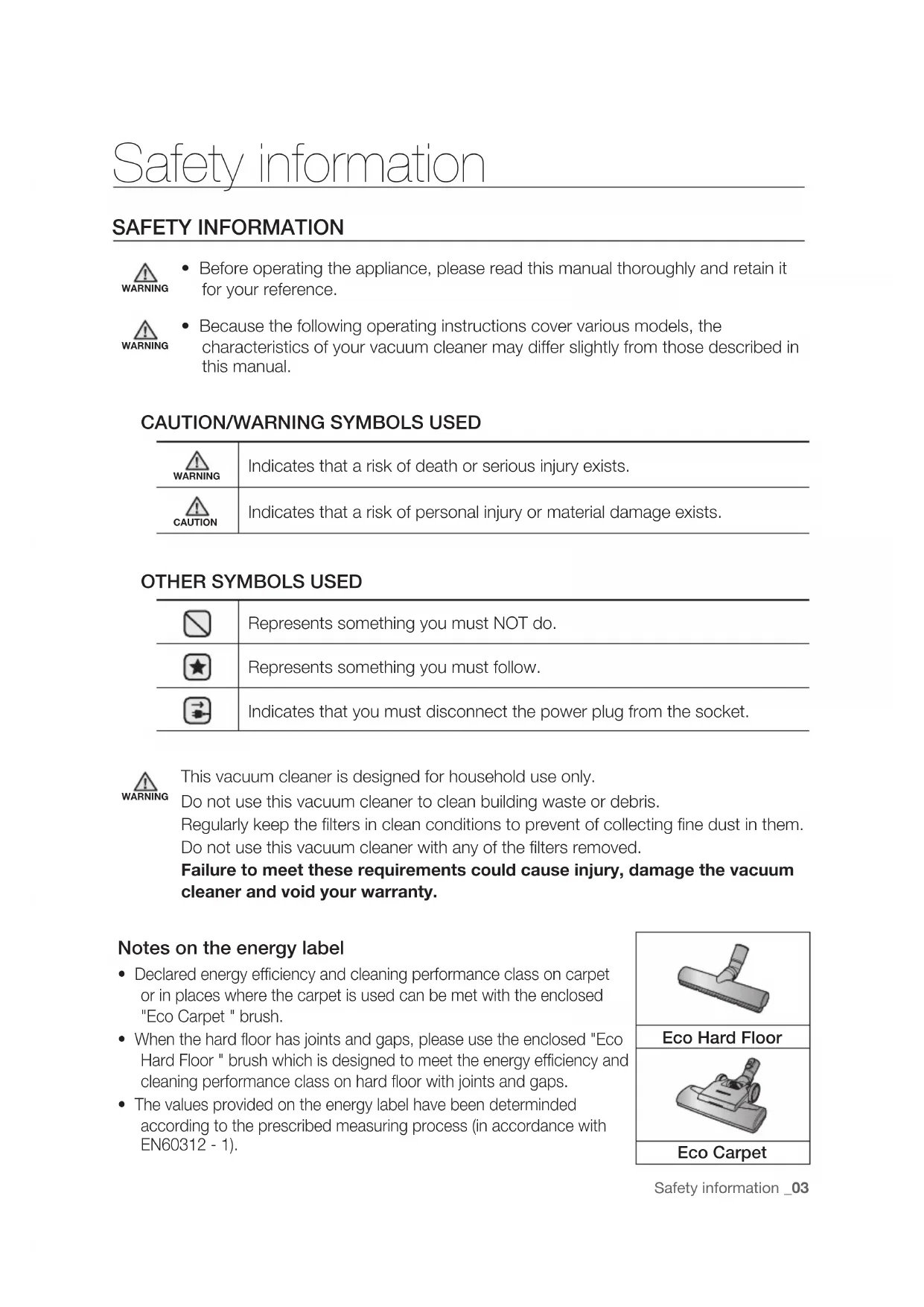 Indicates that you must disconnect the power plug from the socket. WARNING This vacuum cleaner is designed for household use only.