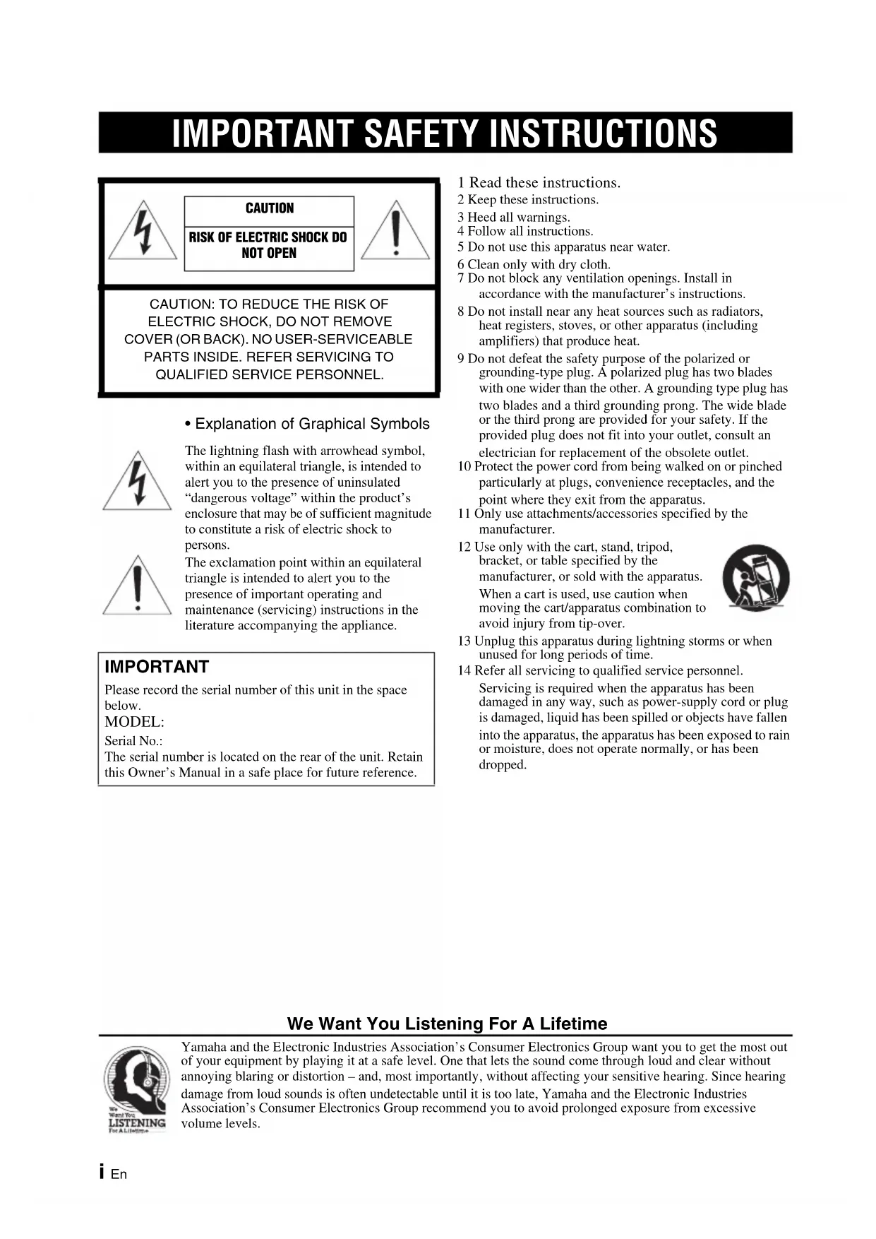 IMPORTANT SAFETY INSTRUCTIONS CAUTION RISK OF ELECTRIC SHOCK DO NOT OPEN CAUTION: TO REDUCE THE RISK OF ELECTRIC SHOCK, DO NOT REMOVE COVER (OR BACK). NO USER-SERVICEABLE PARTS INSIDE. REFER SERVICING TO QUALIFIED SERVICE PERSONNEL.