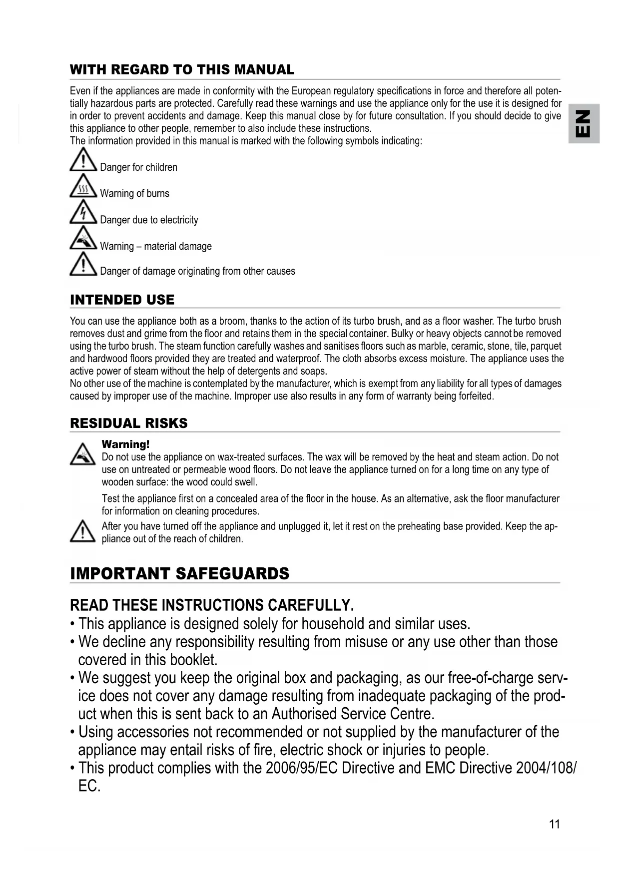 tially hazardous parts are protected. Carefully read these warnings and use the appliance only for the use it is designed for