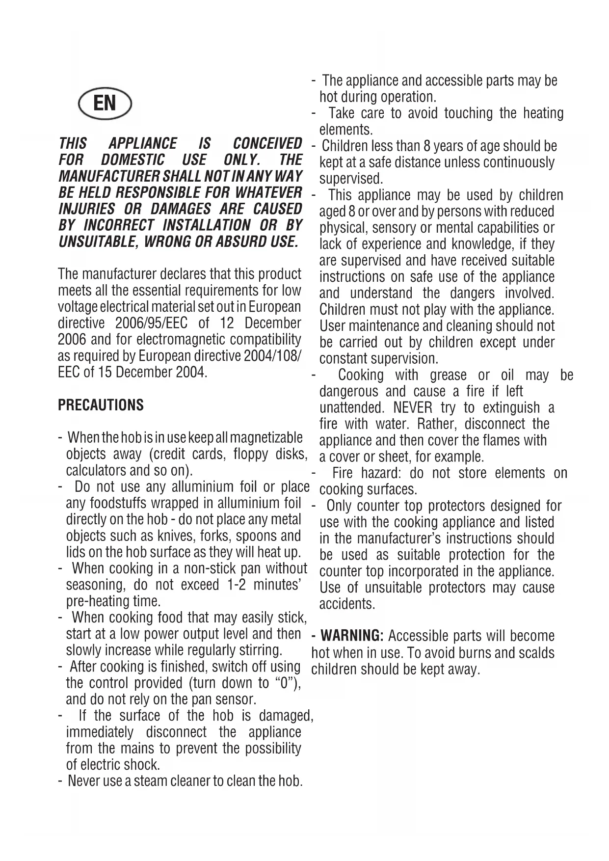 UNSUITABLE, WRONG OR ABSURD USE. The manufacturer declares that this product meets all the essential requirements for low voltage electrical material set out in European directive 2006/95/EEC of 12 December 2006 and for electromagnetic compatibility as required by European directive 2004/108/ EEC of 15 December 2004. PRECAUTIONS - When the hob is in use keep all magnetizable objects away (credit cards, oppy disks, calculators and so on). - Do not use any alluminium foil or place any foodstuffs wrapped in alluminium foil directly on the hob - do not place any metal objects such as knives, forks, spoons and lids on the hob surface as they will heat up. - When cooking in a non-stick pan without seasoning, do not exceed 1-2 minutes’ pre-heating time. - When cooking food that may easily stick, start at a low power output level and then slowly increase while regularly stirring. - After cooking is nished, switch off using the control provided (turn down to “0”), and do not rely on the pan sensor. - If the surface of the hob is damaged, immediately disconnect the appliance from the mains to prevent the possibility of electric shock. - Never use a steam cleaner to clean the hob. - The appliance and accessible parts may be hot during operation. - Take care to avoid touching the heating elements. - Children less than 8 years of age should be kept at a safe distance unless continuously supervised. - This appliance may be used by children aged 8 or over and by persons with reduced physical, sensory or mental capabilities or lack of experience and knowledge, if they are supervised and have received suitable instructions on safe use of the appliance and understand the dangers involved. Children must not play with the appliance. User maintenance and cleaning should not be carried out by children except under constant supervision. - Cooking with grease or oil may be dangerous and cause a re if left unattended. NEVER try to extinguish a re with water. Rather, disconnect the appliance and then cover the ames with a cover or sheet, for example. - Fire hazard: do not store elements on cooking surfaces. - Only counter top protectors designed for use with the cooking appliance and listed in the manufacturer’s instructions should be used as suitable protection for the counter top incorporated in the appliance. Use of unsuitable protectors may cause accidents. - WARNING: Accessible parts will become hot when in use. To avoid burns and scalds children should be kept away. ENInsert in the xed wiring a mean for disconnection from the supply mains having a contact separation in all poles that provide full disconnection under overvoltage category III conditions, in accordance with the wiring rules. The plug or omnipolar switch must be easily reached on the installed equipment. This appliance is not intended to be used via an external timer or a remote control system. The manufacturers decline any responsi- bility in the event of non-compliance with what is described above and the accident prevention norms not being respected and followed. To avoid all risk, if the power cable becomes damaged, it must only be replaced by the manufacturer, by an authorised service centre, or by a qualied electrician. OPERATING PRINCIPLE (Fig. 1) It exploits the electromagnetic properties of most cooking vessels. The coil (inductor) which produces the electromagnetic eld is operated and controlled by the electronic circuit. The heat is transmitted to food by the cooking vessel itself. The cooking process takes place as described below. - loss of heat is minimum (high efciency) - the system stops automatically when the vessel is removed or even just lifted from the hob - the electronic circuit guarantees maximum exibility and ne adjustments. (Fig. 1) 1 Vessel 2 Induced current 3 Magnetic eld 4 Inductor 5 Electronic circuit 6 Power supply User’s Instructions (Fig. 2) 1 ON/OFF 2 Minus – 3 Plus + 4 Cooking zone 5 Setting level display 6 Zone selection lights Installation All operations relative to installation (electric connection) should be carried out by skilled personnel in conformity with the rules in force. As for the specic instructions see part pertaining to installer. Switching the Touch Control ON/OFF “Z” After mains voltage is applied the control initializes for approx. 1 second before it is ready for operation. After a reset all displays and LEDs glow for approx. 1 second. When this time is over all displays and LEDs extinguish and the control is in the stand-by mode. Press the ON/OFF (1) button to switch the touch control on. The cooking zone displays show a static “0“. If a cooking zone is in the “hot“ status, the display shows a static “H“ instead of “0“. The bottom right dot is blinking in 1 second intervals on all cooking zone displays to indicate that no cooking zone is selected at the moment. After switching-ON the electronic control remains activated for 20 seconds. If no cooking zone or timer selection follows within this period of time, the electronic control automatically switches back into the stand-by-mode. The control can only be switched- ON if it identies the ON/OFF key alone being operated. Should it recognize key activation other than that, the control remains in the standby- mode. If the child safety feature is active when switching on, all cooking zones show “L“, (LOCKED). If the cooking zones are in a “hot“ status, the display shows “L“ and “H“ in alternation. When the Touch Control is ON it can be switched- OFF at anytime by operating the ON/OFF key. This is also valid if the control has been locked (activated child safety feature). The ON/OFF key has always priority in the switch-OFF function. Automatic switch-OFF When the control is ON it automatically sw itches-OFF after 20 seconds if no cooking zone or select key has been operated within this period of time. If case of a cooking zone selection, the automatic switch- OFF time is composed of 10 seconds desele