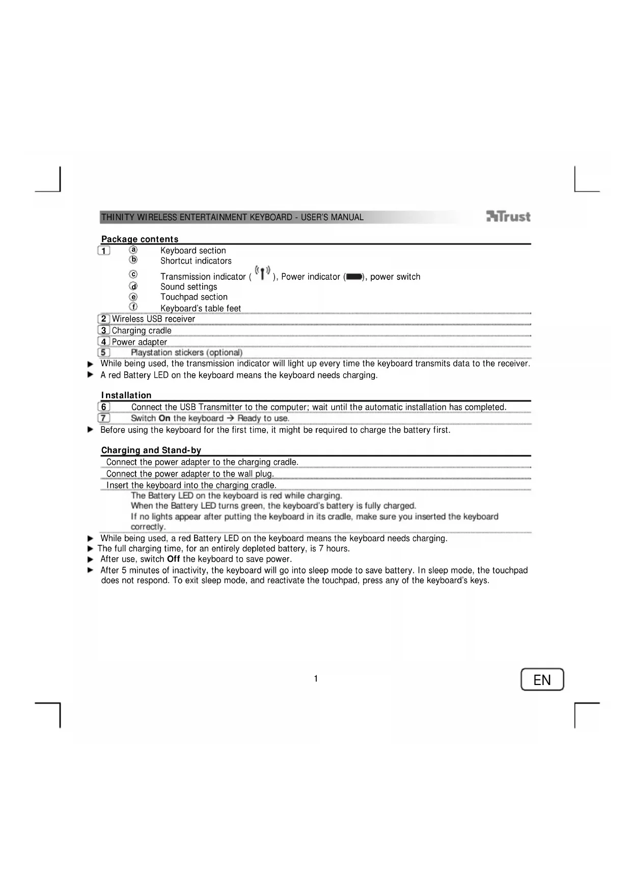 2 Wireless USB receiver 3 Charging cradle 4 Power adapter 5 Playstation stickers (optional) While being used, the transmission indicator will light up every time the keyboard transmits data to the receiver. A red Battery LED on the keyboard means the keyboard needs charging. Installation 6 Connect the USB Transmitter to the computer; wait until the automatic installation has completed. 7 Switch On the keyboard Ready to use. Before using the keyboard for the first time, it might be required to charge the battery first. Charging and Stand-by Connect the power adapter to the charging cradle. Connect the power adapter to the wall plug. Insert the keyboard into the charging cradle. The Battery LED on the keyboard is red while charging. When the Battery LED turns green, the keyboard’s battery is fully charged. If no lights appear after putting the keyboard in its cradle, make sure you inserted the keyboard correctly. While being used, a red Battery LED on the keyboard means the keyboard needs charging. The full charging time, for an entirely depleted battery, is 7 hours. After use, switch Off the keyboard to save power. After 5 minutes of inactivity, the keyboard will go into sleep mode to save battery. In sleep mode, the touchpad does not respond. To exit sleep mode, and reactivate the touchpad, press any of the keyboard’s keys.THINITY ESS ENTERTAINMENT KEYBOARD - USER’S MANUAL