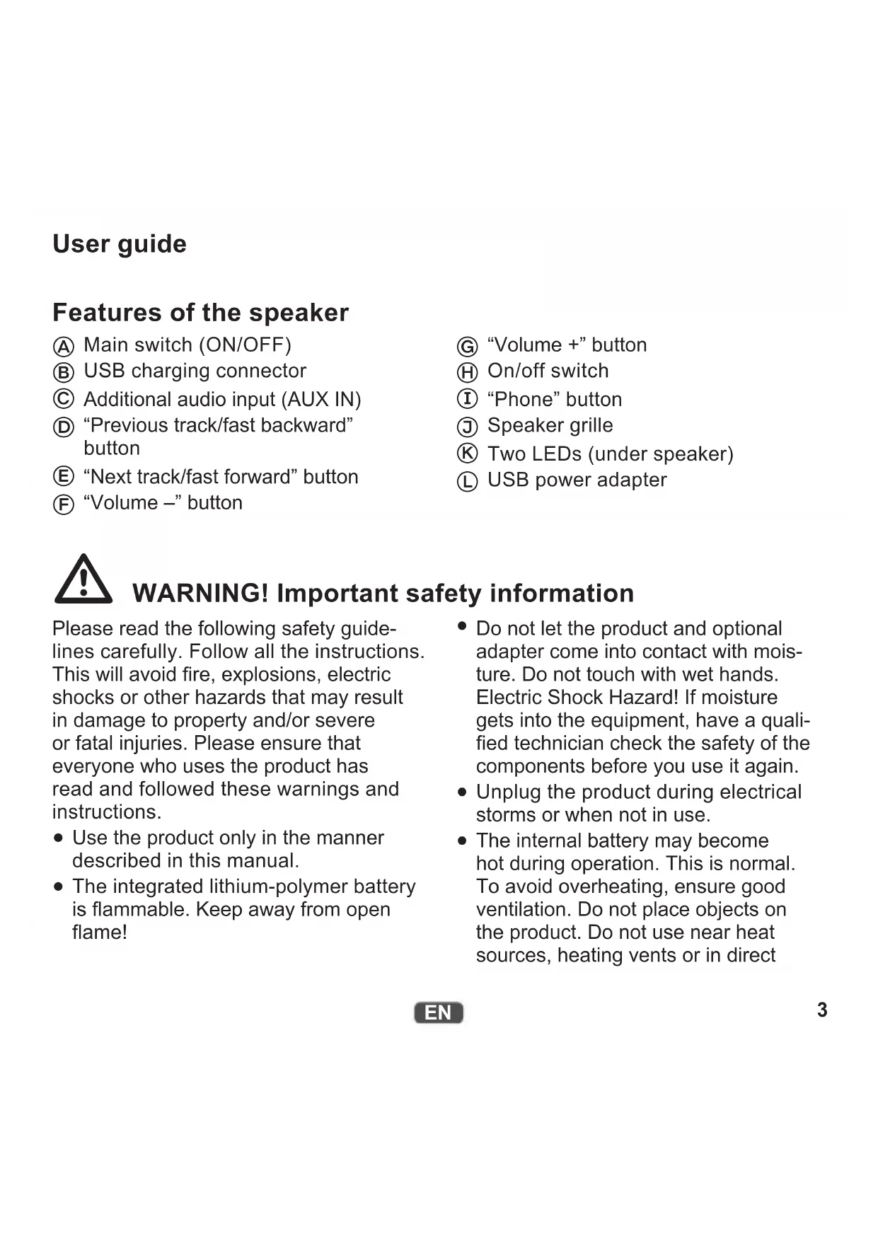 USB power adapter WARNING! Important safety information Please read the following safety guide- lines carefully. Follow all the instructions. This will avoid re, explosions, electric shocks or other hazards that may result in damage to property and/or severe or fatal injuries. Please ensure that everyone who uses the product has read and followed these warnings and instructions.