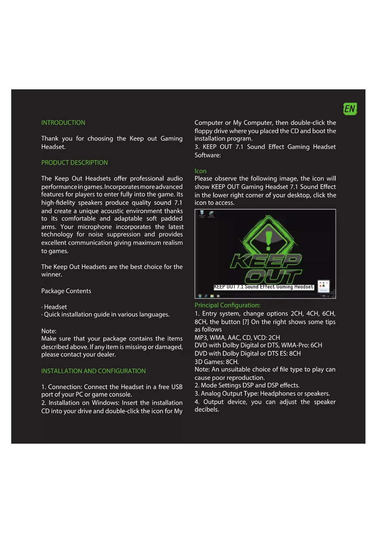 Software: Icon Please observe the following image, the icon will show KEEP OUT Gaming Headset 7.1 Sound Eect in the lower right corner of your desktop, click the icon to access. KEEP OUT 7.1 Sound Effect Gaming Headset INTRODUCTION Thank you for choosing the Keep out Gaming Headset. PRODUCT DESCRIPTION The Keep Out Headsets oer professional audio performance in games. Incorporates more advanced features for players to enter fully into the game. Its high-delity speakers produce quality sound 7.1 and create a unique acoustic environment thanks to its comfortable and adaptable soft padded arms. Your microphone incorporates the latest technology for noise suppression and provides excellent communication giving maximum realism to games. The Keep Out Headsets are the best choice for the winner. Package Contents
