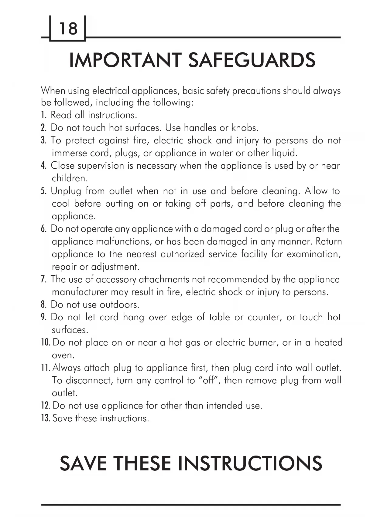 IMPORTANT SAFEGUARDS When using electrical appliances, basic safety precautions should always