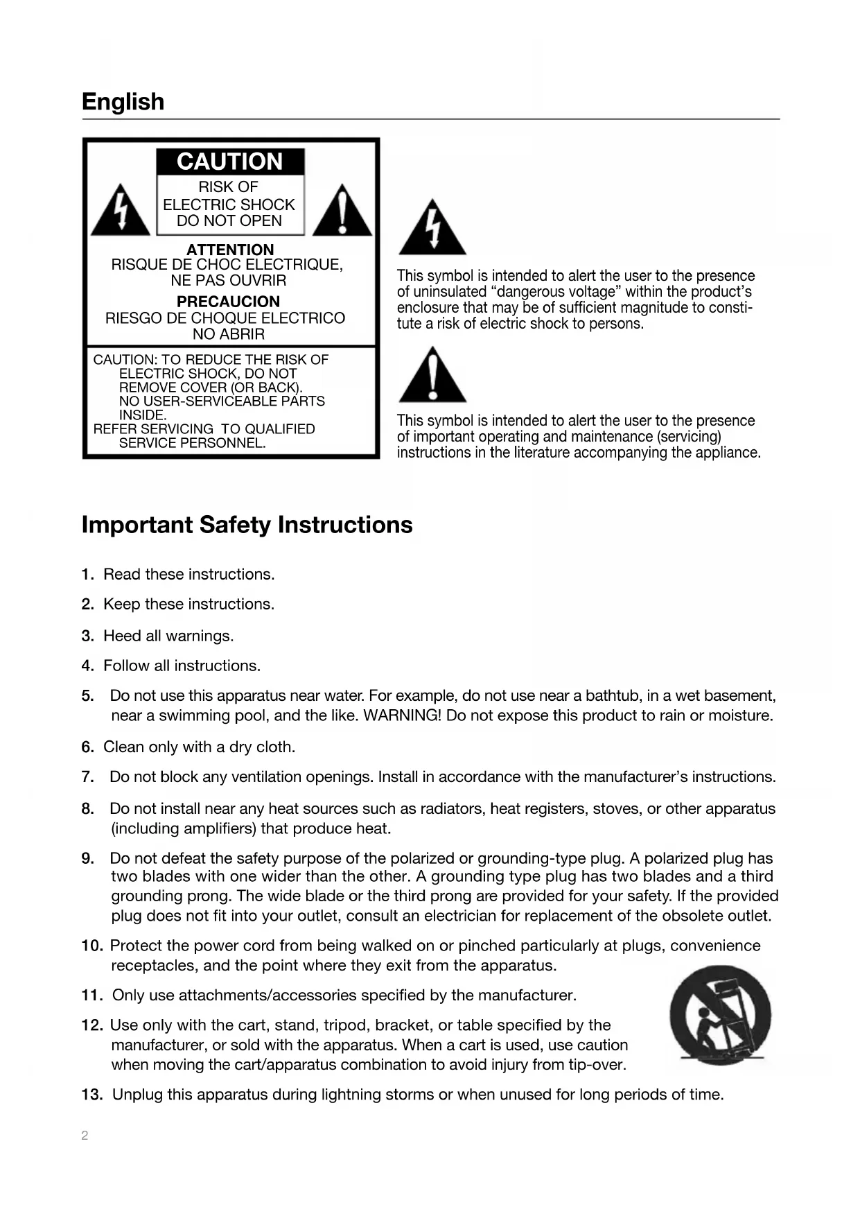 ATTENTIONRISQUE DE CHOC ELECTRIQUE,NE PAS OUVRIRPRECAUCIONRIESGO DE CHOQUE ELECTRICONO ABRIRCAUTION: TO REDUCE THE RISK OF ELECTRIC SHOCK, DO NOTREMOVE COVER (OR BACK).NO USER-SERVICEABLE PARTS INSIDE.REFER SERVICING TO QUALIFIED SERVICE PERSONNEL. This symbol is intended to alert the user to the presence of uninsulated “dangerous voltage” within the product’s enclosure that may be of sufficient magnitude to consti- tute a risk of electric shock to persons. This symbol is intended to alert the user to the presence of important operating and maintenance (servicing) instructions in the literature accompanying the appliance. English3