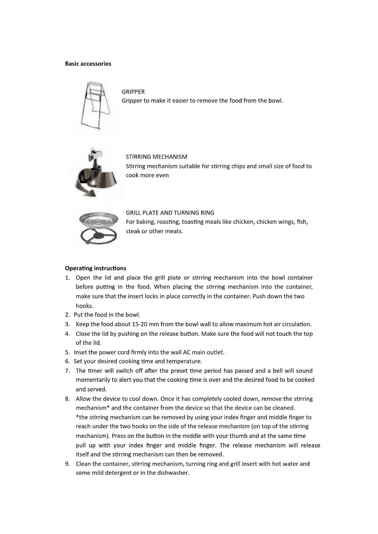 9. Clean the container, stirring mechanism, turning ring and grill insert with hot water and