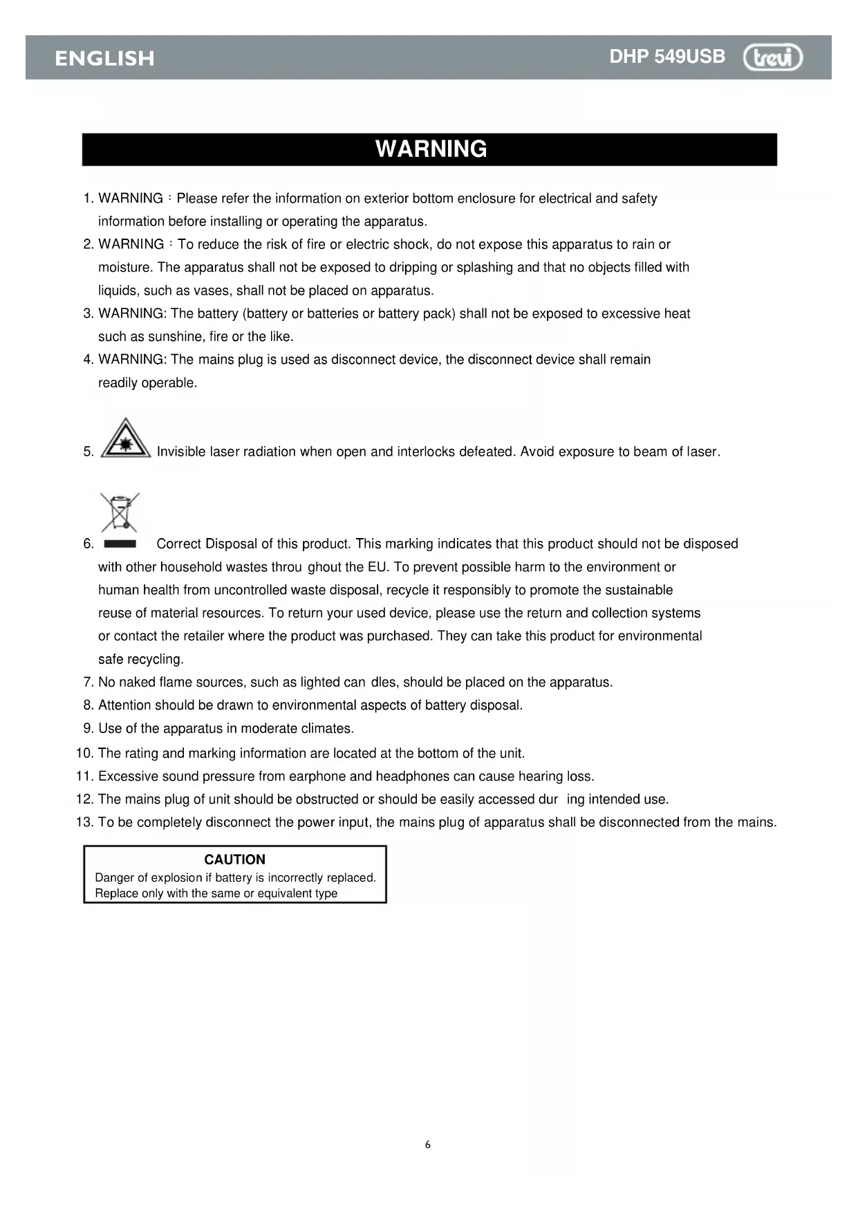 Danger of explosion if battery is incorrectly replaced. Replace only with the same or equivalent type CAUTION7 DHP 549USB ENGLISH WARNING TO PREVENT FIRE OR SHOCK HAZARD DO NOT EXPOSE THIS APPLIANCE TO RAIN OR MOISTURE.