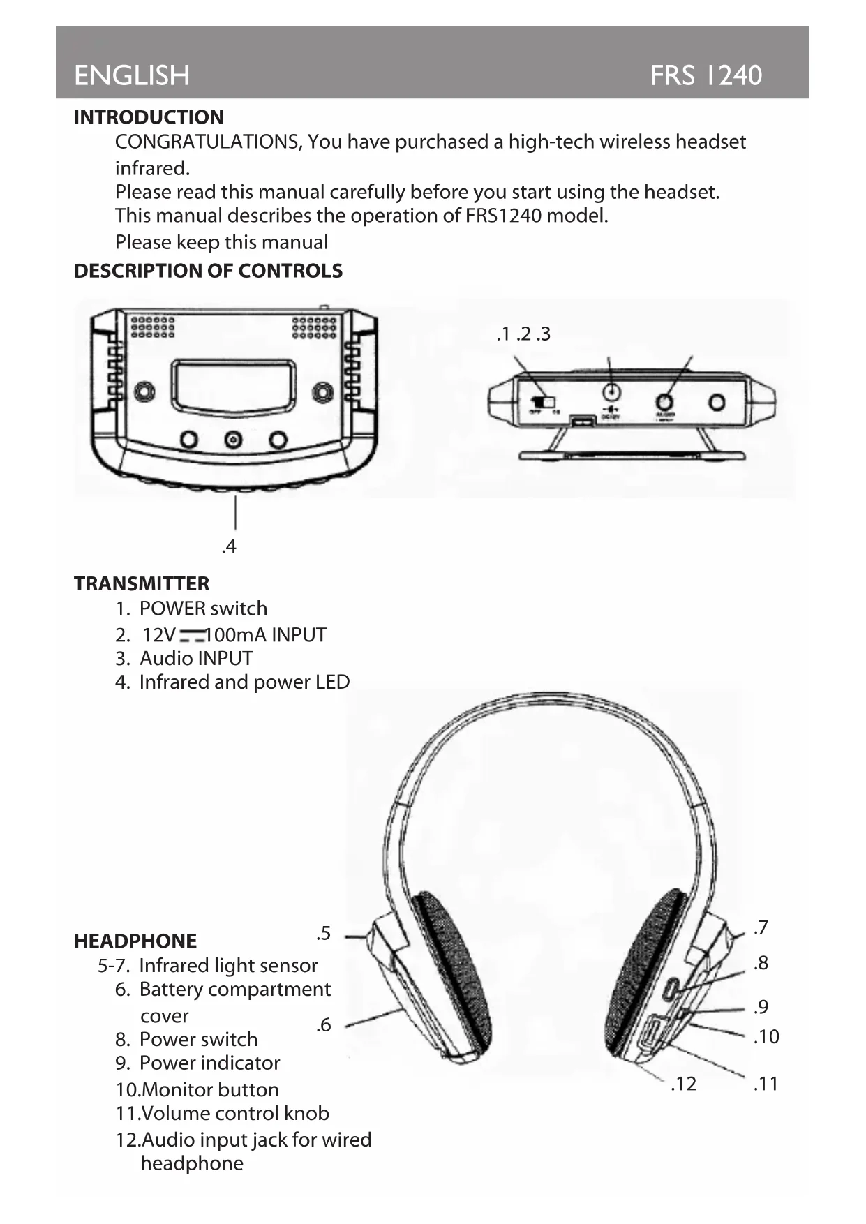 INTRODUCTION CONGRATULATIONS, You have purchased a high-tech wireless headset infrared. Please read this manual carefully before you start using the headset. This manual describes the operation of FRS1240 model. Please keep this manual