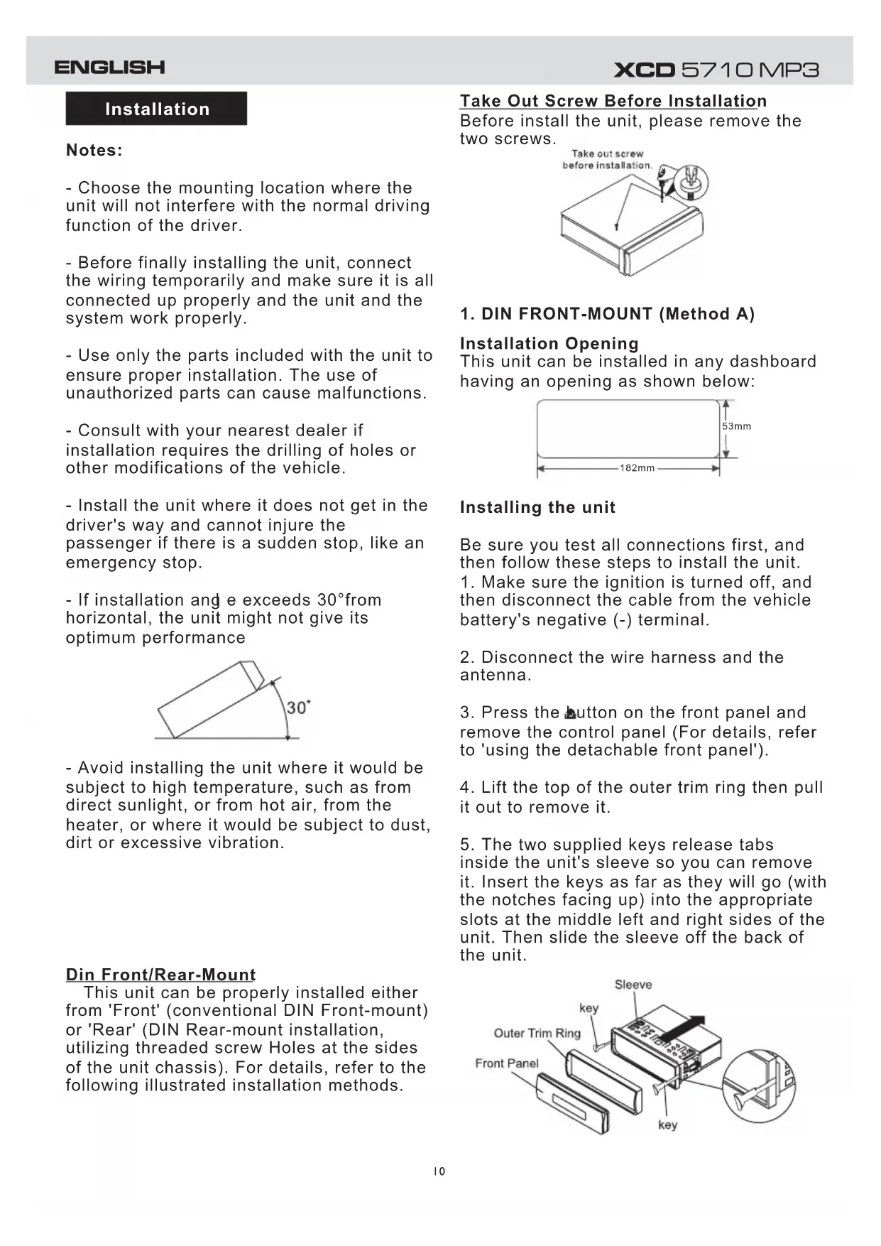 This unit can be properly installed either from 'Front' (conventional DIN Front-mount) or 'Rear' (DIN Rear-mount installation, utilizing threaded screw Holes at the sides of the unit chassis). For details, refer to the following illustrated installation methods.