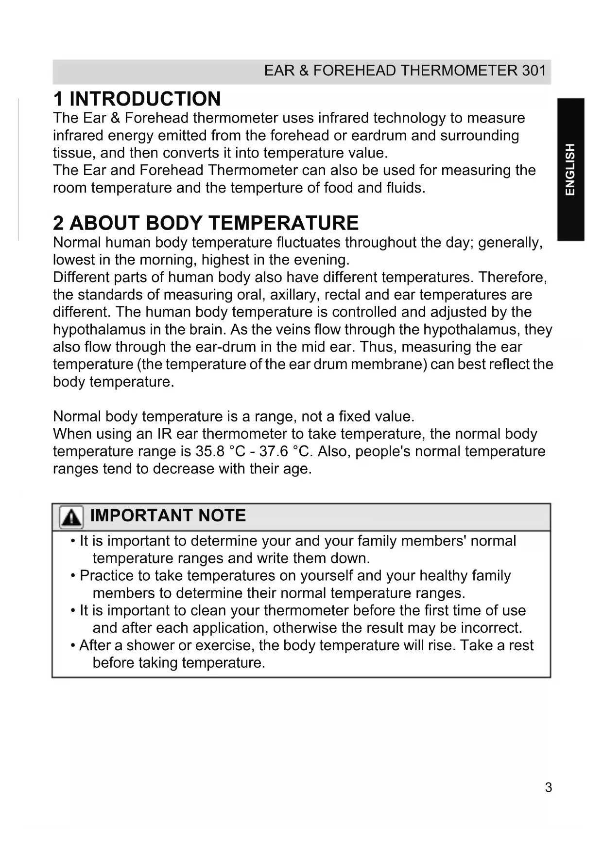 ENGLISH 1 INTRODUCTION The Ear & Forehead thermometer uses infrared technology to measure infrared energy emitted from the forehead or eardrum and surrounding tissue, and then converts it into temperature value. The Ear and Forehead Thermometer can also be used for measuring the room temperature and the temperture of food and fluids.