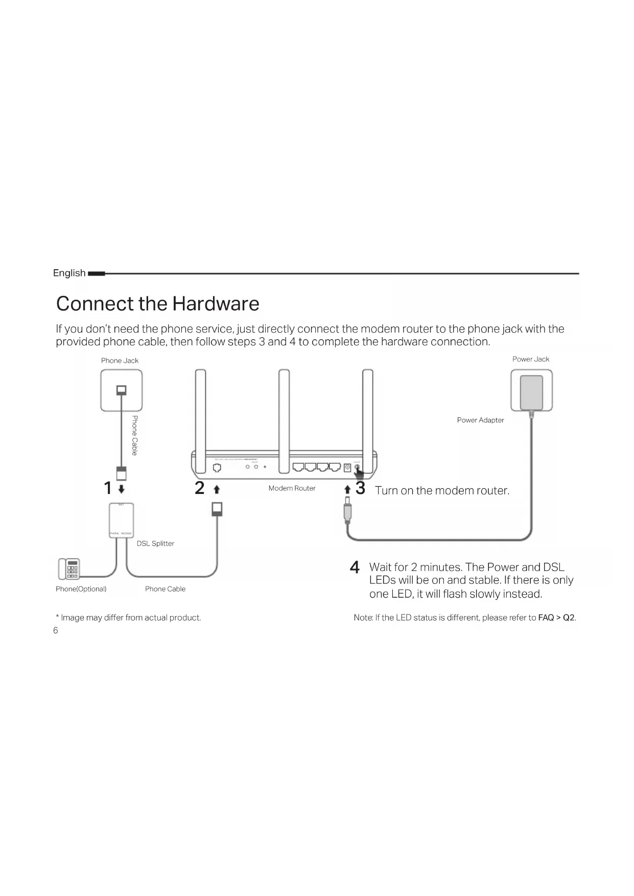 1 2 DSL LAN1 LAN2 LAN3 LAN4/WAN POWER POWERON/OFFWPS RESETWiFiON/OFF * Image may dier from actual product. Note: If the LED status is dierent, please refer to FAQ > Q2.