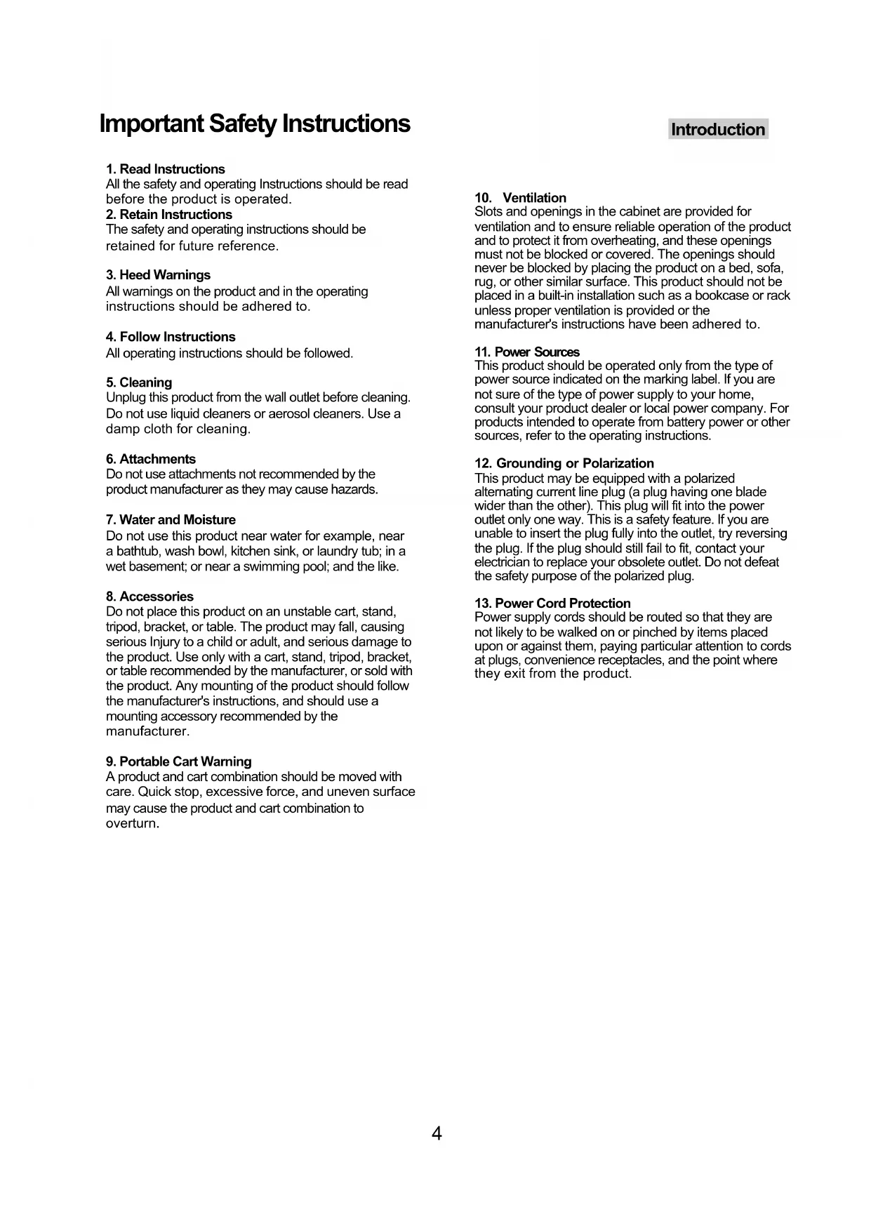 Power supply cords should be routed so that they are not likely to be walked on or pinched by items placed upon or against them, paying particular attention to cords at plugs, convenience receptacles, and the point where they exit from the product. Introduction 4Important Safety Instructions