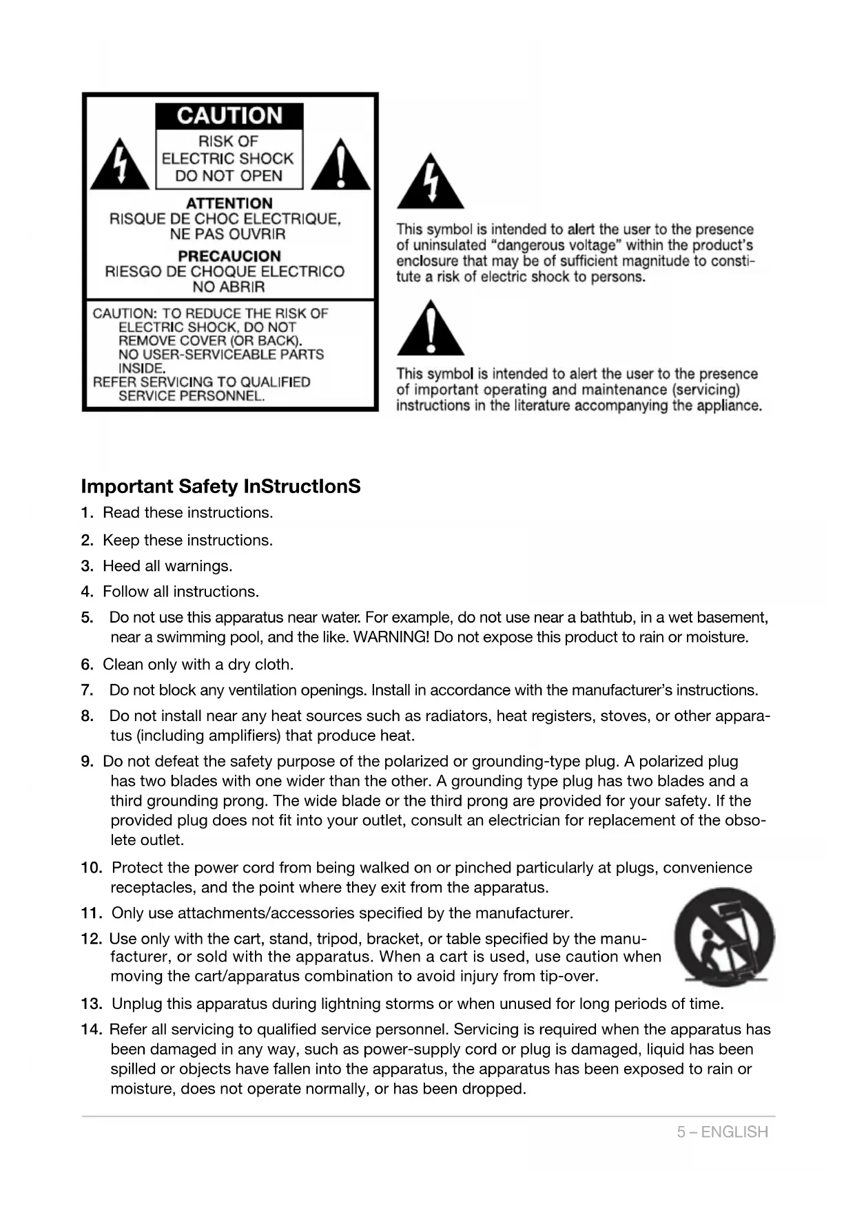 14. Refer all servicing to qualified service personnel. Servicing is required when the apparatus has
