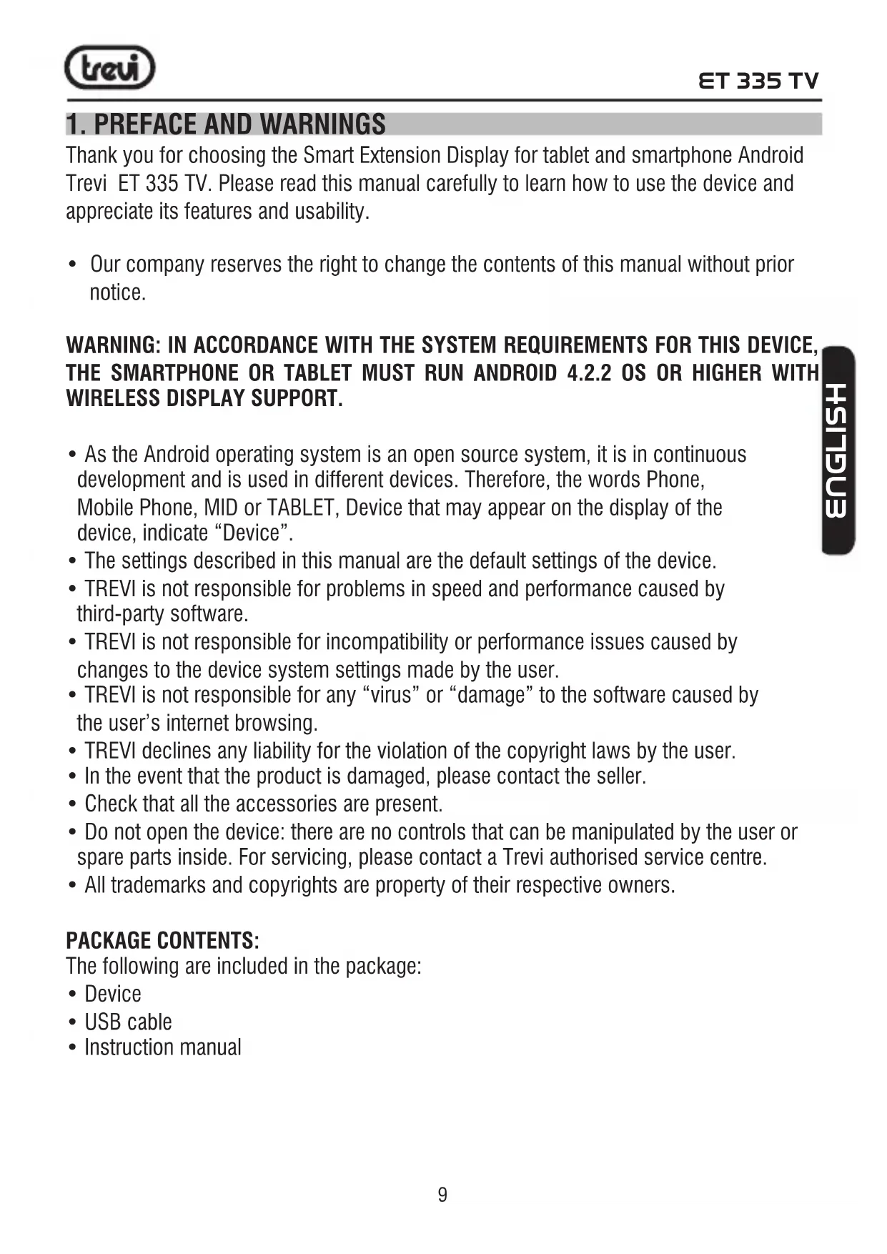Thank you for choosing the Smart Extension Display for tablet and smartphone Android Trevi ET 335 TV. Please read this manual carefully to learn how to use the device and appreciate its features and usability.