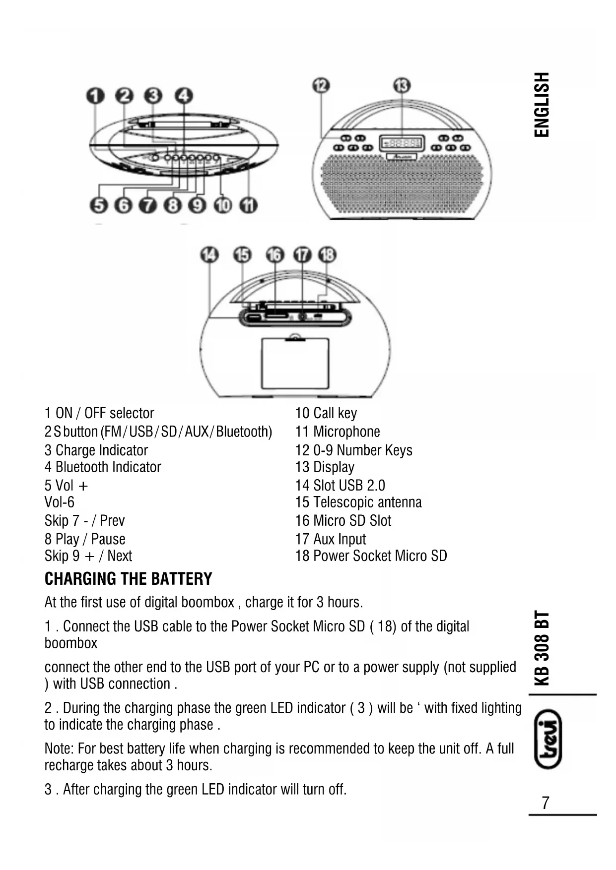 At the first use of digital boombox , charge it for 3 hours. 1 . Connect the USB cable to the Power Socket Micro SD ( 18) of the digital boombox connect the other end to the USB port of your PC or to a power supply (not supplied ) with USB connection . 2 . During the charging phase the green LED indicator ( 3 ) will be ‘ with fixed lighting to indicate the charging phase . Note: For best battery life when charging is recommended to keep the unit off. A full recharge takes about 3 hours. 3 . After charging the green LED indicator will turn off.KB 308 BT