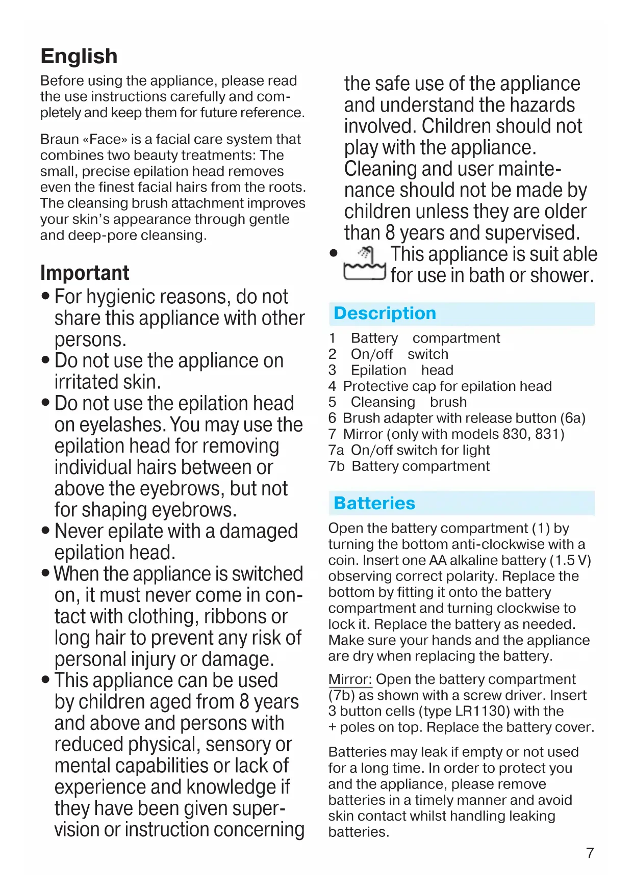 Download the instructions for your Epilator in PDF format for free! Find your manual SE831 Face - BRAUN and take your electronic device back in hand. On this page are published all the documents necessary for the use of your device. SE831 Face by BRAUN.