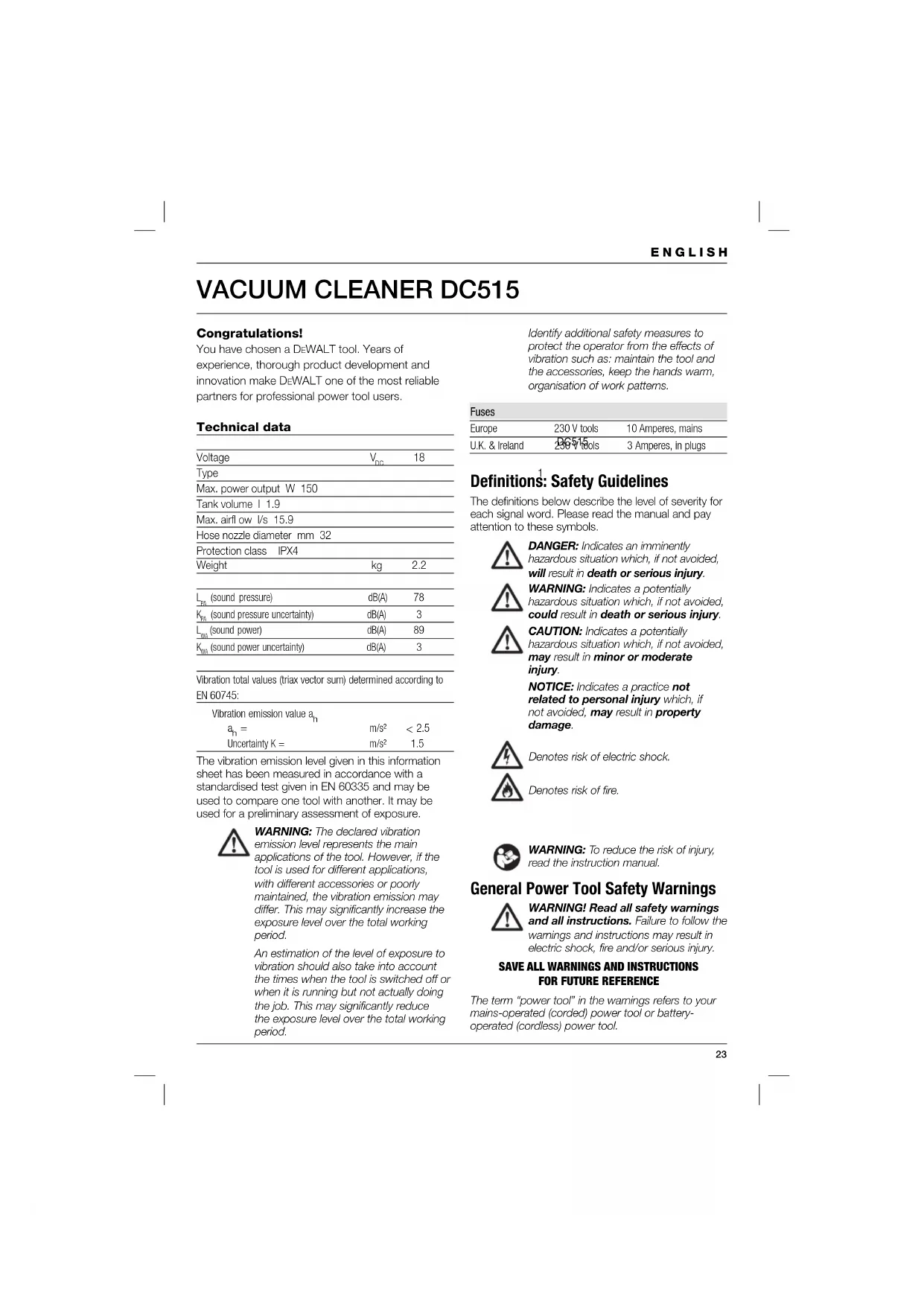 SAVE ALL WARNINGS AND INSTRUCTIONS FOR FUTURE REFERENCE The term “power tool” in the warnings refers to your mains-operated (corded) power tool or battery-operated (cordless) power tool. VACUUM CLEANER DC515