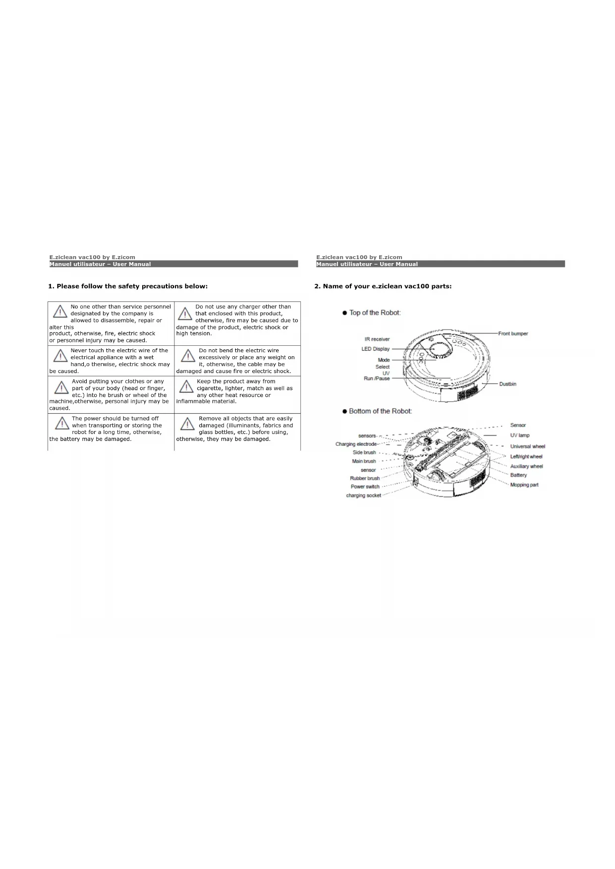 between 1, 2 and 3 secondary modes, the display will show corresponding digit. Modes: 1 – The cleaner will work until the battery is used out and then search the charging dock station automatically for recharge. 2 – The cleaning work will last for 30 minutes. 3 – The cleaning work will last for 15 minutes.E.ziclean vac100 by E.zicom Manuel utilisateur – User Manual E.ziclean vac100 by E.zicom Manuel utilisateur – User Manual