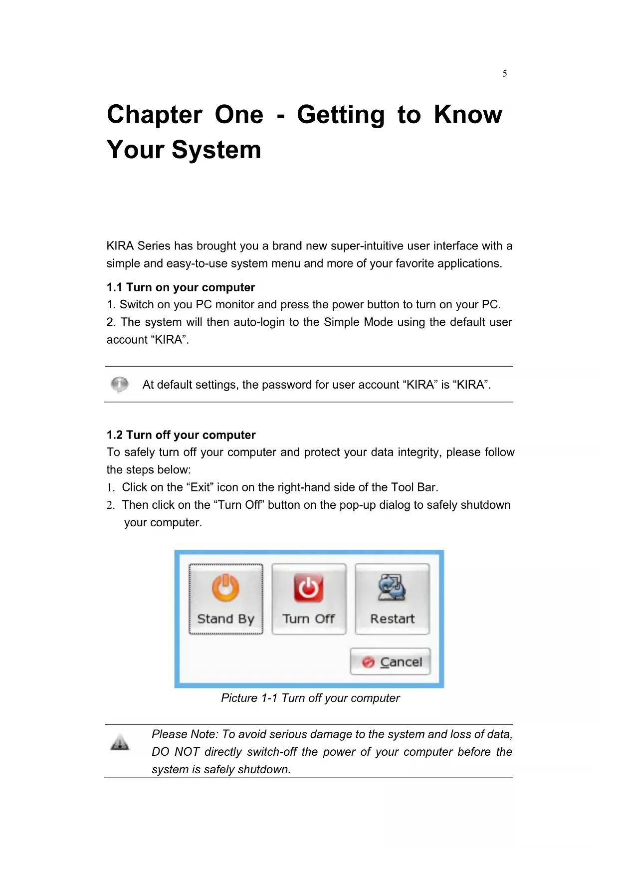 your computer. Picture 1-1 Turn off your computer Please Note: To avoid serious damage to the system and loss of data, DO NOT directly switch-off the power of your computer before the system is safely shutdown.6