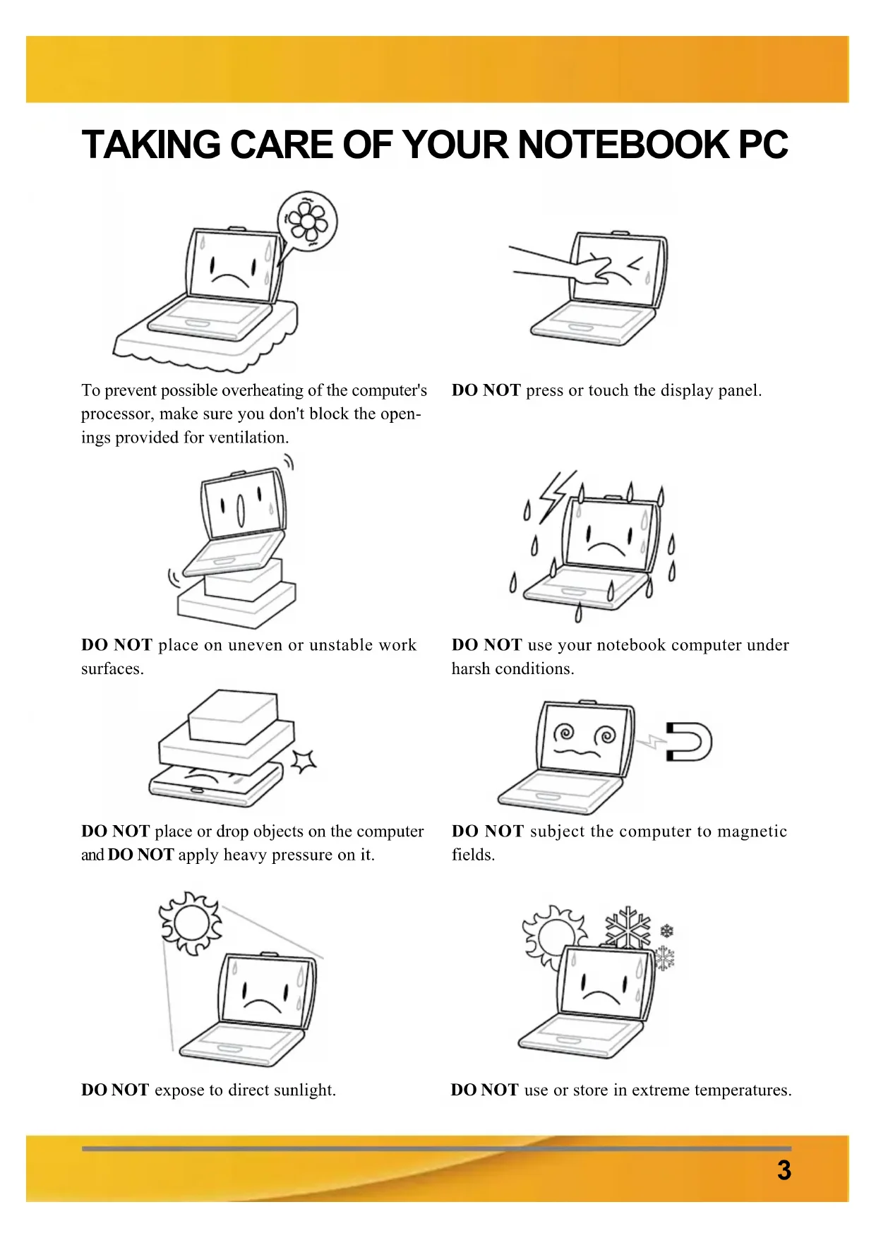 DO NOT place or drop objects on the computer and DO NOT apply heavy pressure on it. DO NOT subject the computer to magnetic fields. To prevent possible overheating of the computer's processor, make sure you don't block the open- ings provided for ventilation. DO NOT press or touch the display panel. DO NOT place on uneven or unstable work surfaces. DO NOT use your notebook computer under harsh conditions. DO NOT expose to direct sunlight. DO NOT use or store in extreme temperatures.ENGLISH DEUTSCHFRANÇAIS ITALIANOESPAÑOL E N G L I S H F R A N Ç A I S D E U T S C H E S P A Ñ O L I T A L I A N O