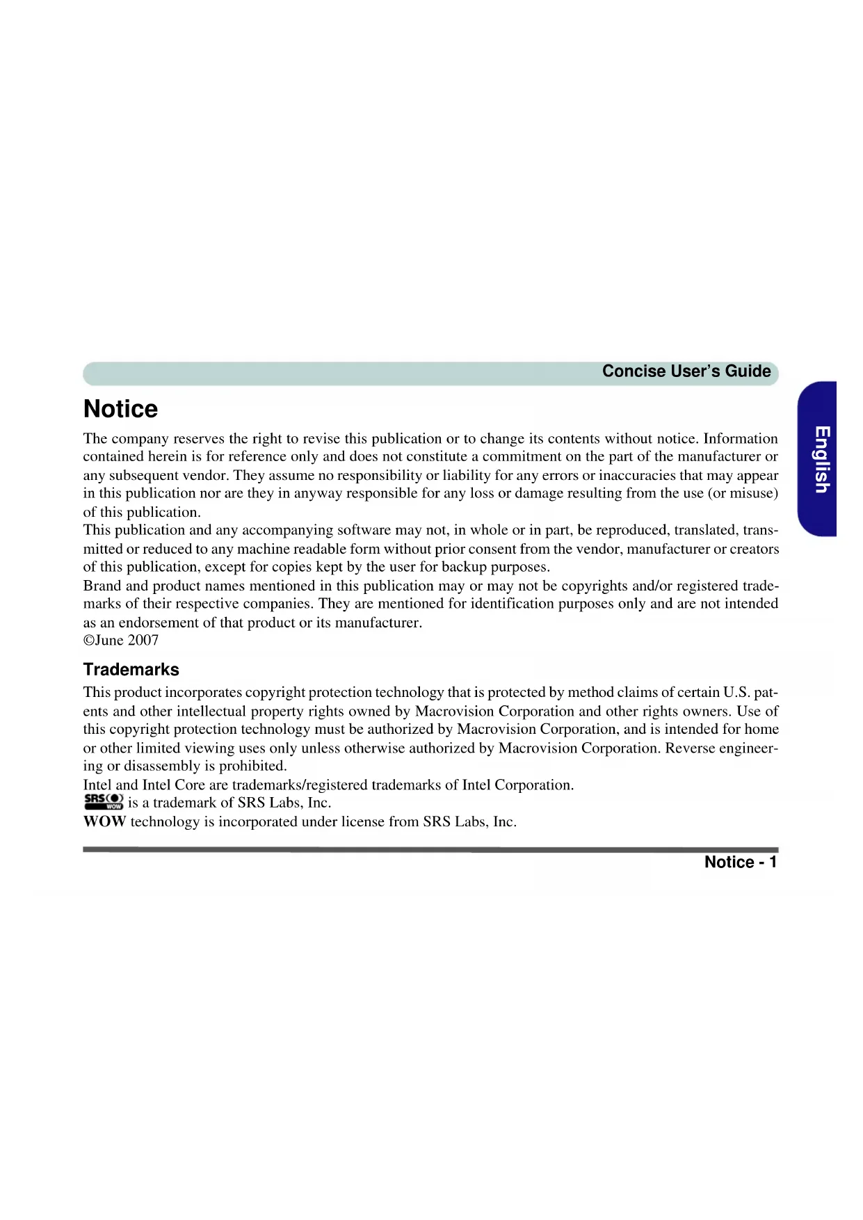 Video Card Options Note that card types, specifications and drivers are sub- ject to continual updates and changes. Check with your service center for the latest details on video cards sup- ported. M570RU Concise UG Vista.book Page 37 Monday, November 5, 2007 9:46 AM38 - Specifications Concise User’s Guide English Storage One Changeable 12.7mm(h) Optical Device (CD/DVD) Type Drive (see “Optional” on page 40 for drive options) Easy Changeable 2.5" 9.5 mm (h) SATA HDD Card Reader Embedded 7-in-1 Card Reader (MS/ MS Pro/ SD/ Mini SD/ MMC/ RS MMC/ MS Duo) Note: MS Duo/ Mini SD/ RS MMC Cards Require a PC Adapter Audio Intel® High Definition Audio Interface (HDA) 3D Stereo Enhanced Sound System SRS WOW Surround Sound Technology Inside Sound-Blaster PRO™ Compatible S/PDIF Digital Output 7.1CH Built-In Microphone 2 * Built-In Speakers (1.5W, 8