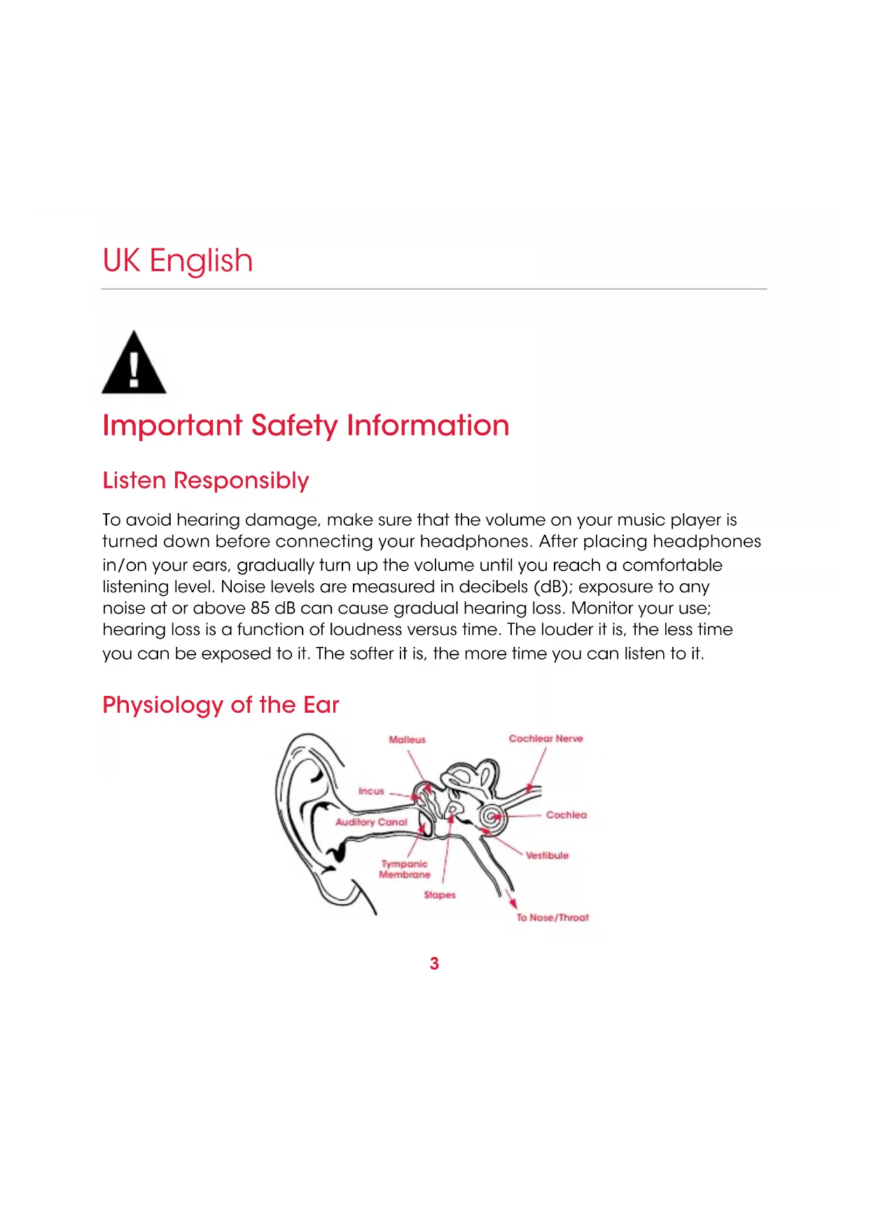 • Chart information from http://www.nidcd.nih.gov/health/education/teachers/pages/common_sounds.aspx UK English This decibel (dB) table compares some common sounds and shows how they rank in potential harm to hearing.5 UK English “…. a typical person can safely listen to an (digital music player) for 4.6 hours per day at 70% volume.” “…. knowing the levels one is listening to music at, and for how long, is extremely important.” From http://www.cbc.ca/health/story/2006/10/19/music-earphones.html Get the most out of your equipment and enjoy great audio performance even at safe levels. Our headphones will allow you to hear more details at lower volume levels than ever before. Use Responsibly Do not use headphones when it’s unsafe to do so – while operating a vehicle, crossing streets, or during any activity or in an environment where your full attention to your surroundings is required. It is dangerous to drive while wearing headphones, and in many places illegal because it decreases your chances of hearing life-saving sounds outside of your vehicle, such as another car’s horn and emergency vehicle sirens. Learn how to establish a safe listening level and review other important safety guidelines from the Consumer Electronics Association at www.ce.org and the Deafness Research Foundation at www.drf.org.6 Eartips and Maintenance Eartip Selection The tips on the ends of urBeats