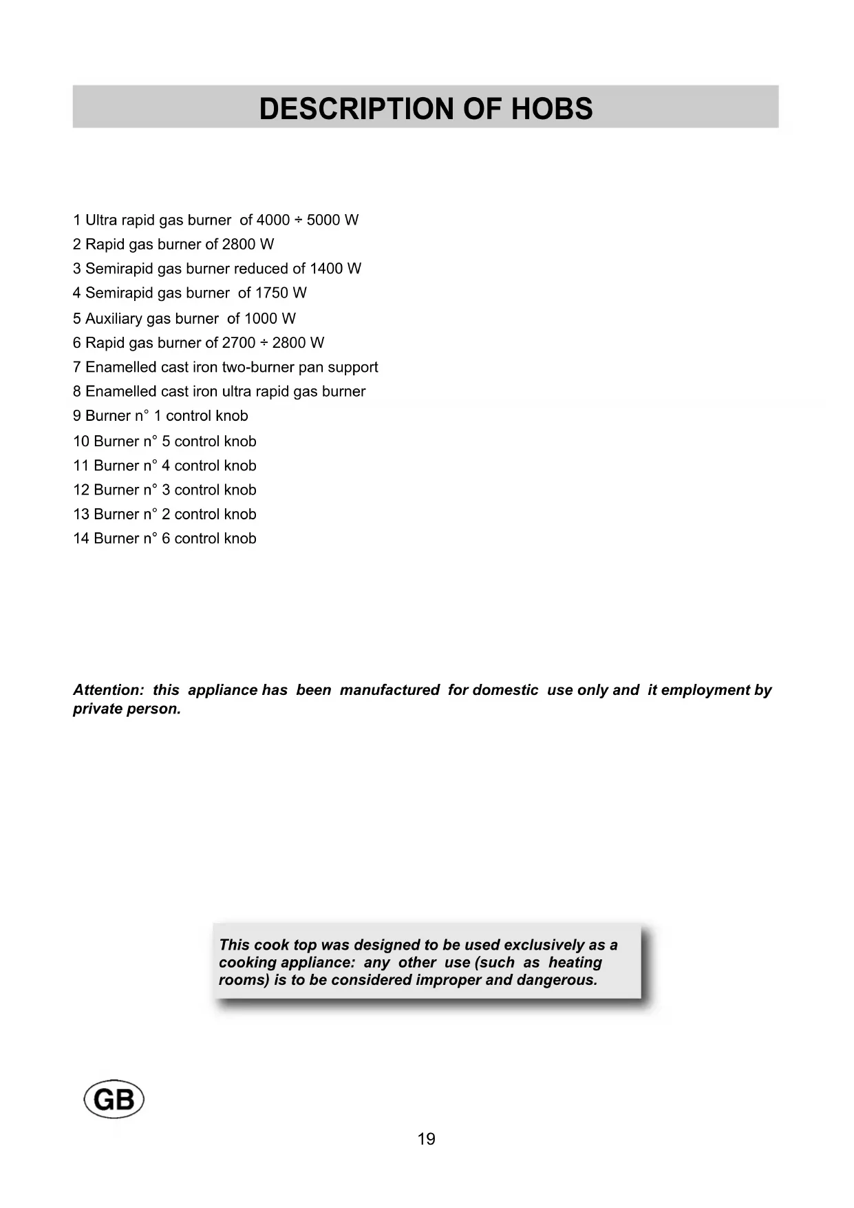 rooms) is to be considered improper and dangerous.1) BURNERS A diagram is screen-printed above each knob on